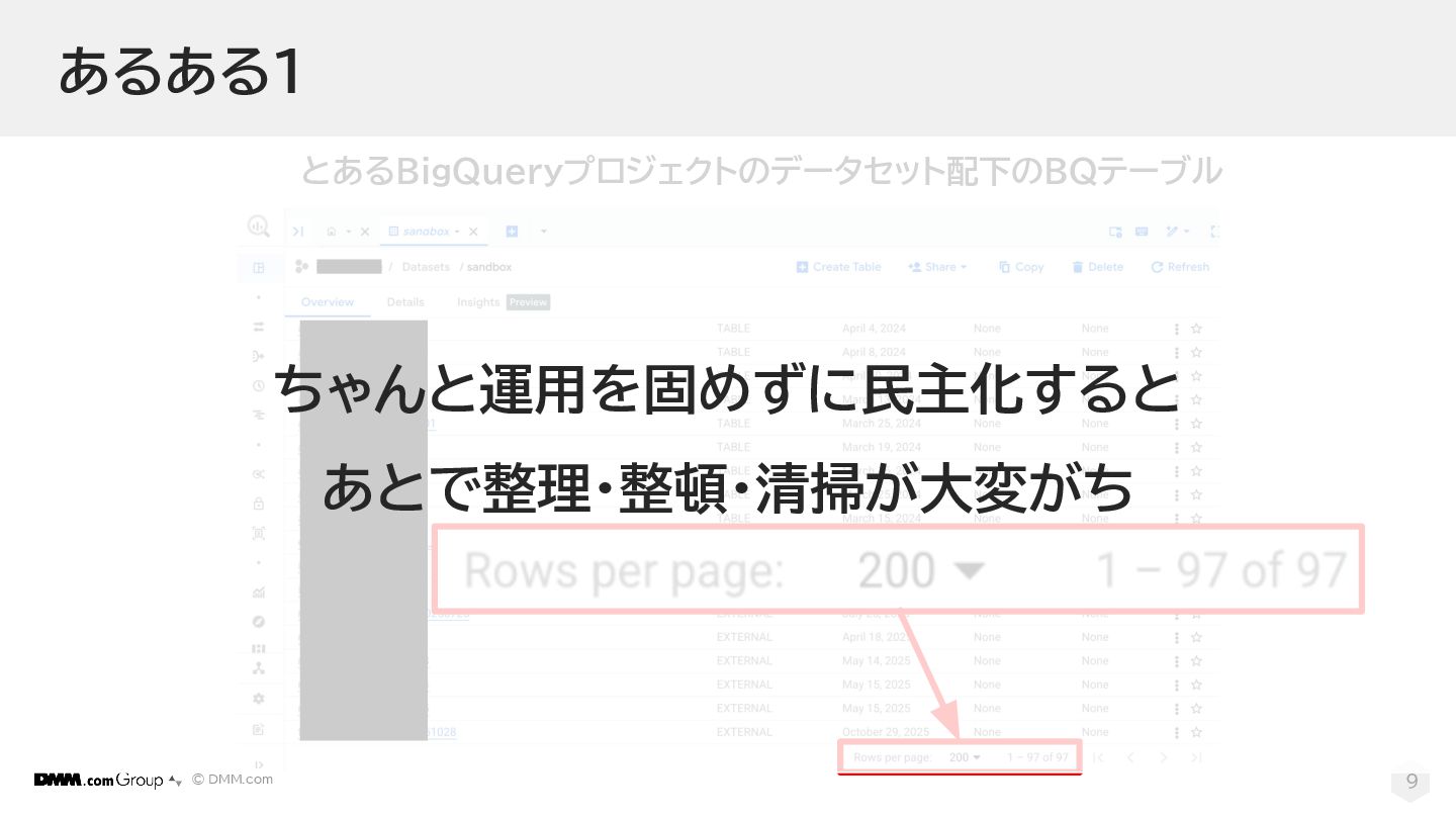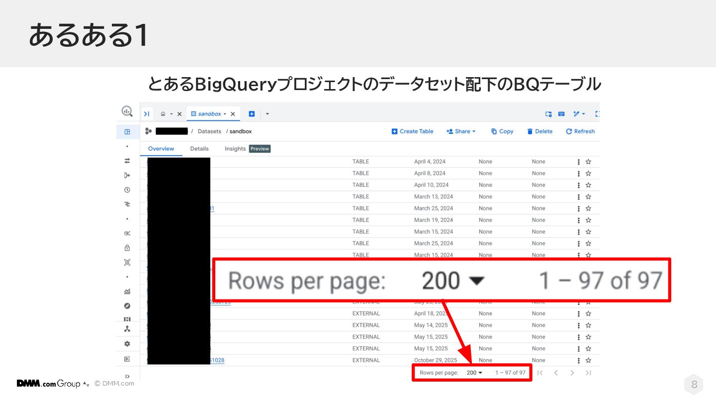 © DMM.com 8 とあるBigQueryプロジェクトのデータセット配下のBQテーブル あるある1