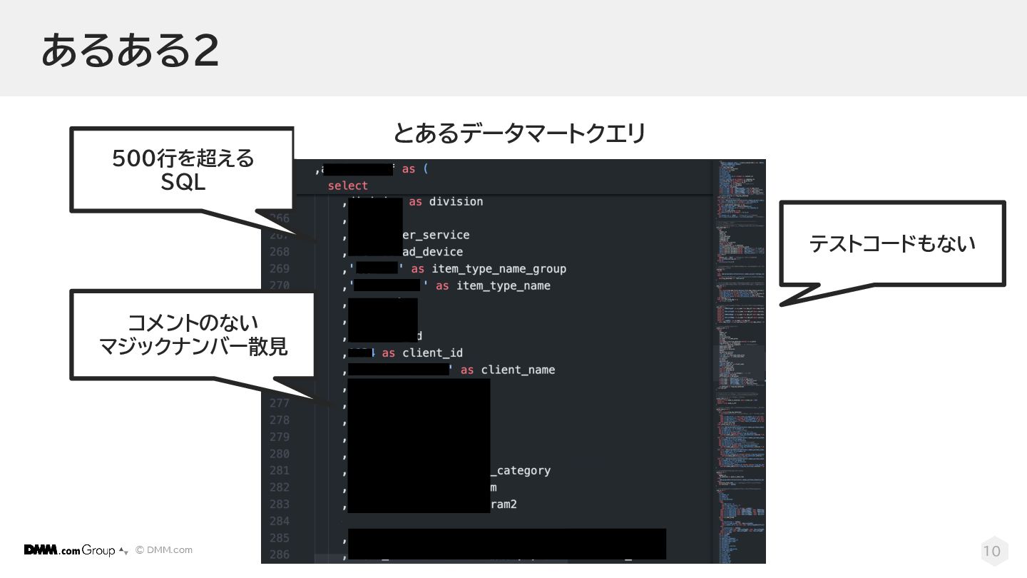 © DMM.com 10 あるある2 500行を超える SQL コメントのない マジックナンバー散見 とあるデータマートクエリ テストコードもない