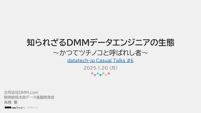 • あらゆる事業のデータが基盤に集約されており、テーブル約5,000件、約4兆レコードと規模がデカい • DMMデータ組織は、機能別3グループの6チーム(3~5名)構成 • DMM insideで、データ組織が何やっているかシリーズ記事での発信を始めた 本題 • DMMデータエンジニアのツールを紹介 • DMMデータエンジニアの働き方を紹介 • Gatherでワイワイ • Miroでワイワイ • Slackで作業ログ • Confluenceでナリッジ共有 • アラート対応・Lookerダッシュボード監視・問い合わせ対応 • 毎月約150本のPRの9割を24時間以内にマージ • プレビュー機能やOSSなど新しい技術を検証・導入 • 会社全体や部内でスキルアップ施策いろいろ • 毎月社内で会食イベント(参加無料)