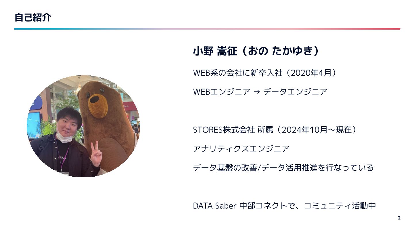 STORES 株式会社 データ本部 データ基盤グループ 小野 嵩征(ono.takayuki)/ アナリティクスエンジニア
