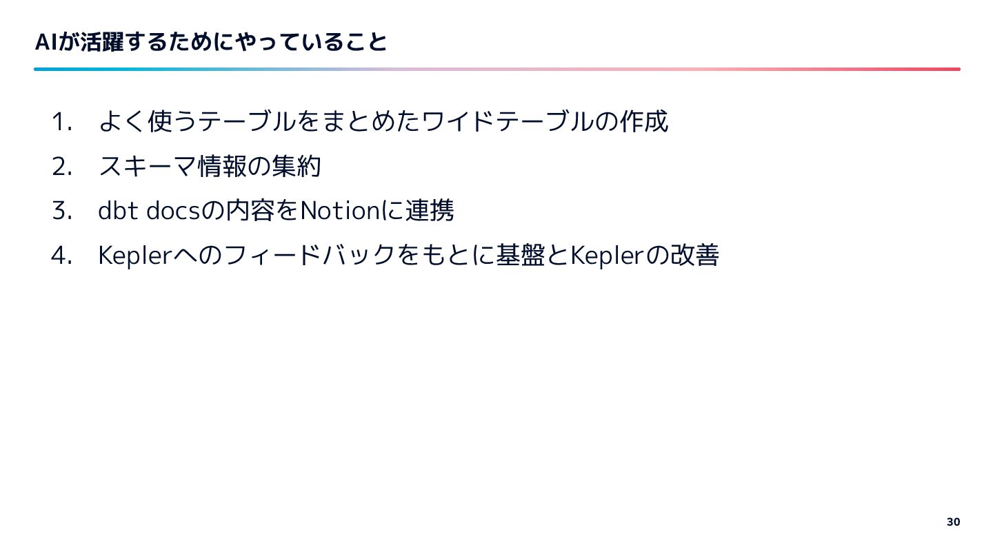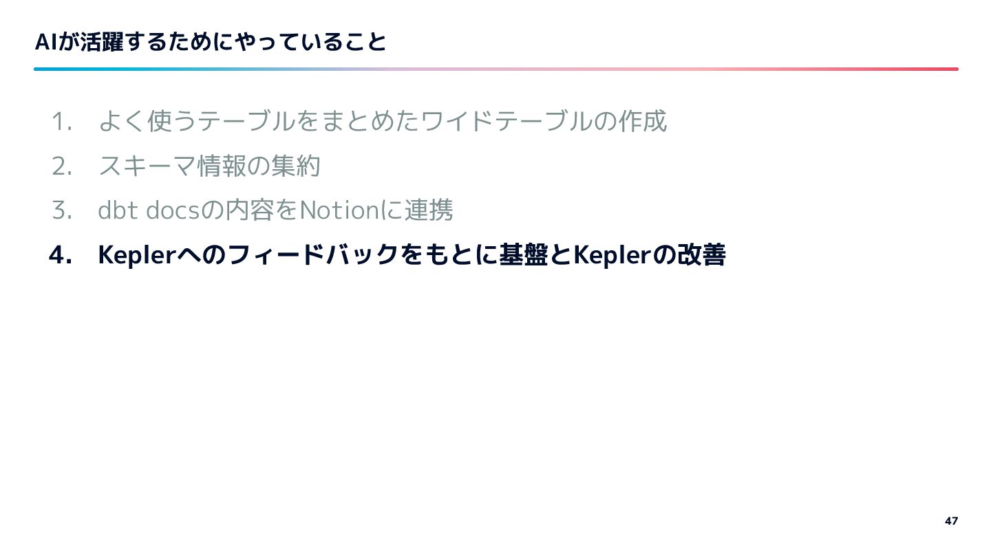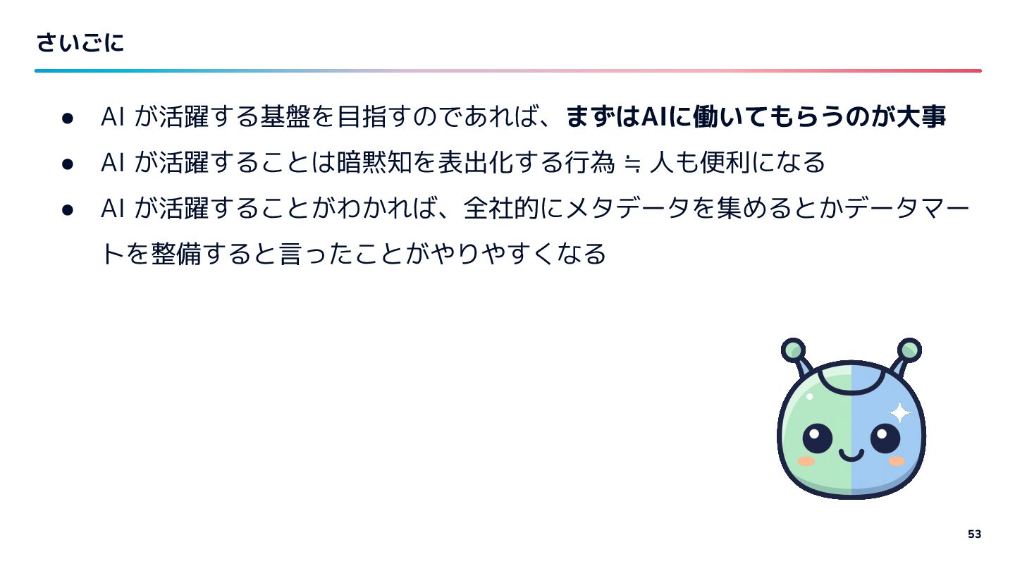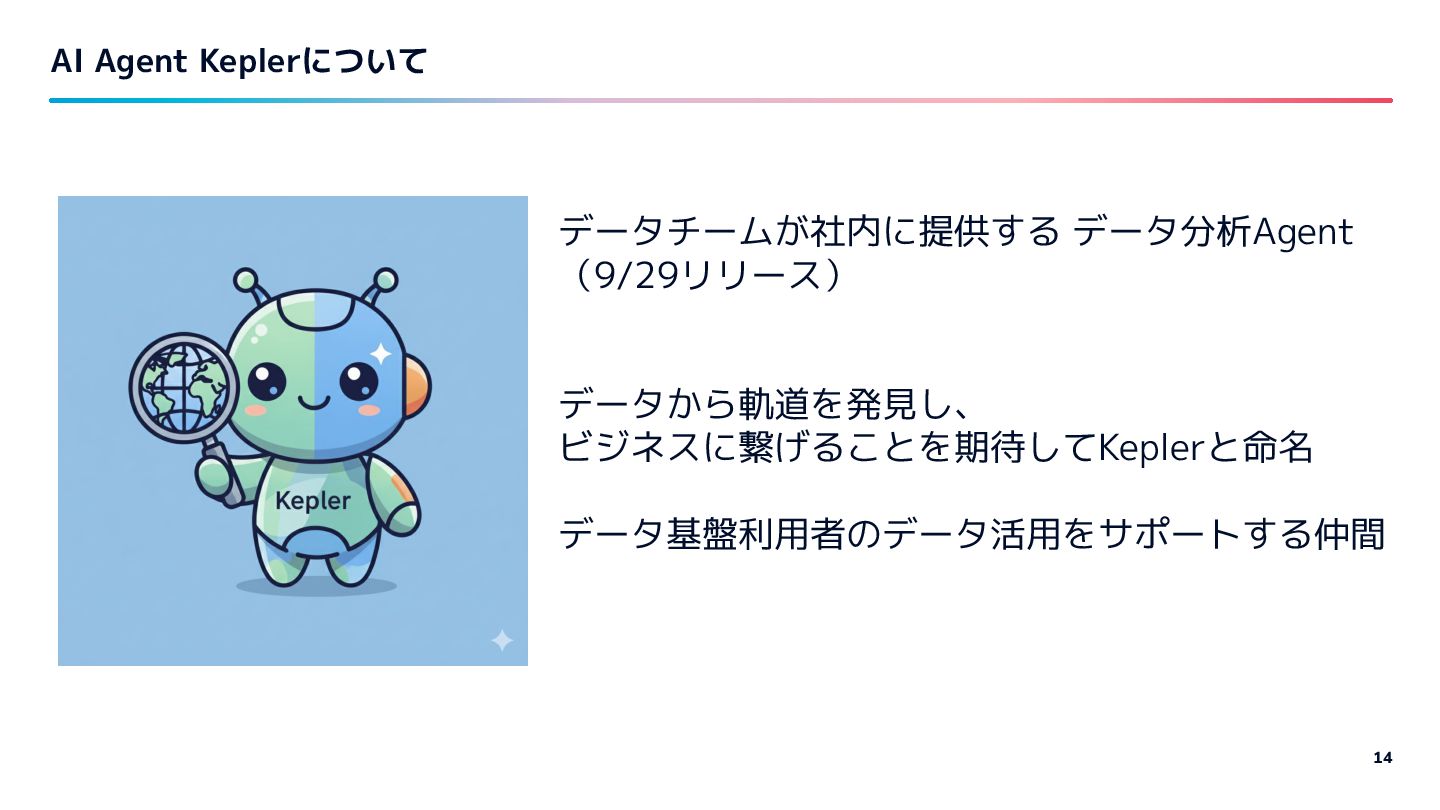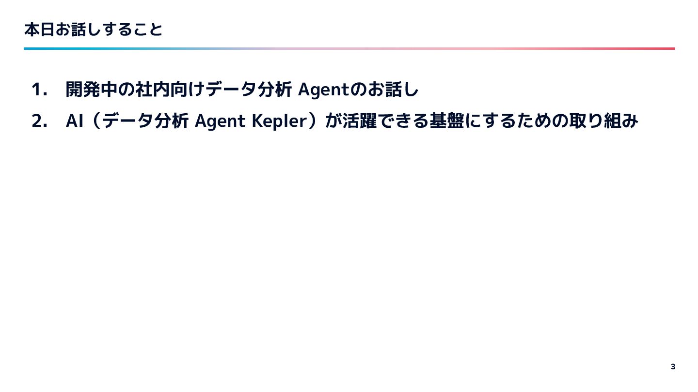 登壇前日に社内にリリースしたデータ分析Agentについて AIが活躍しやすいデータ基盤にするために取り組んでいることについてお話ししました。