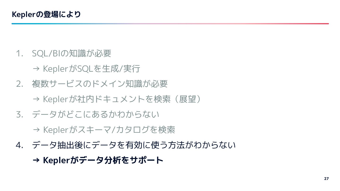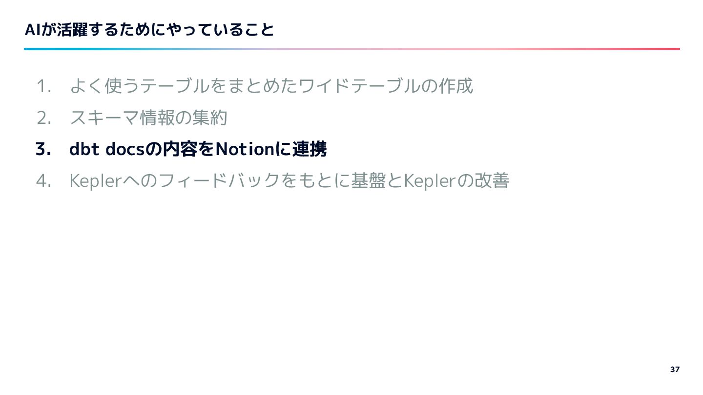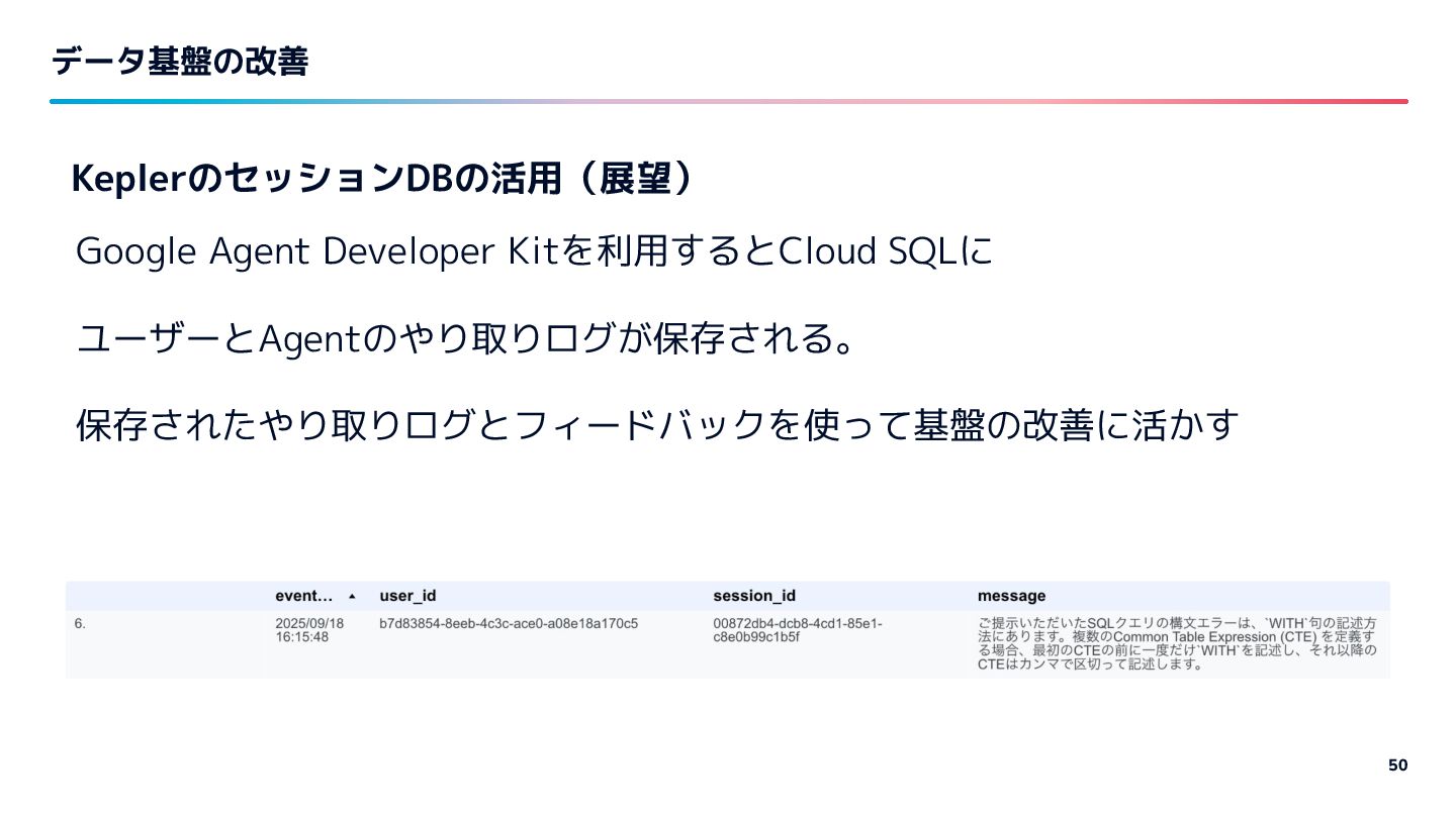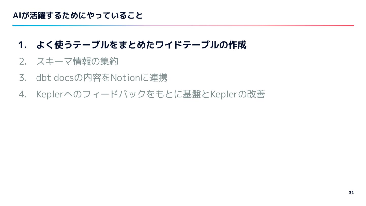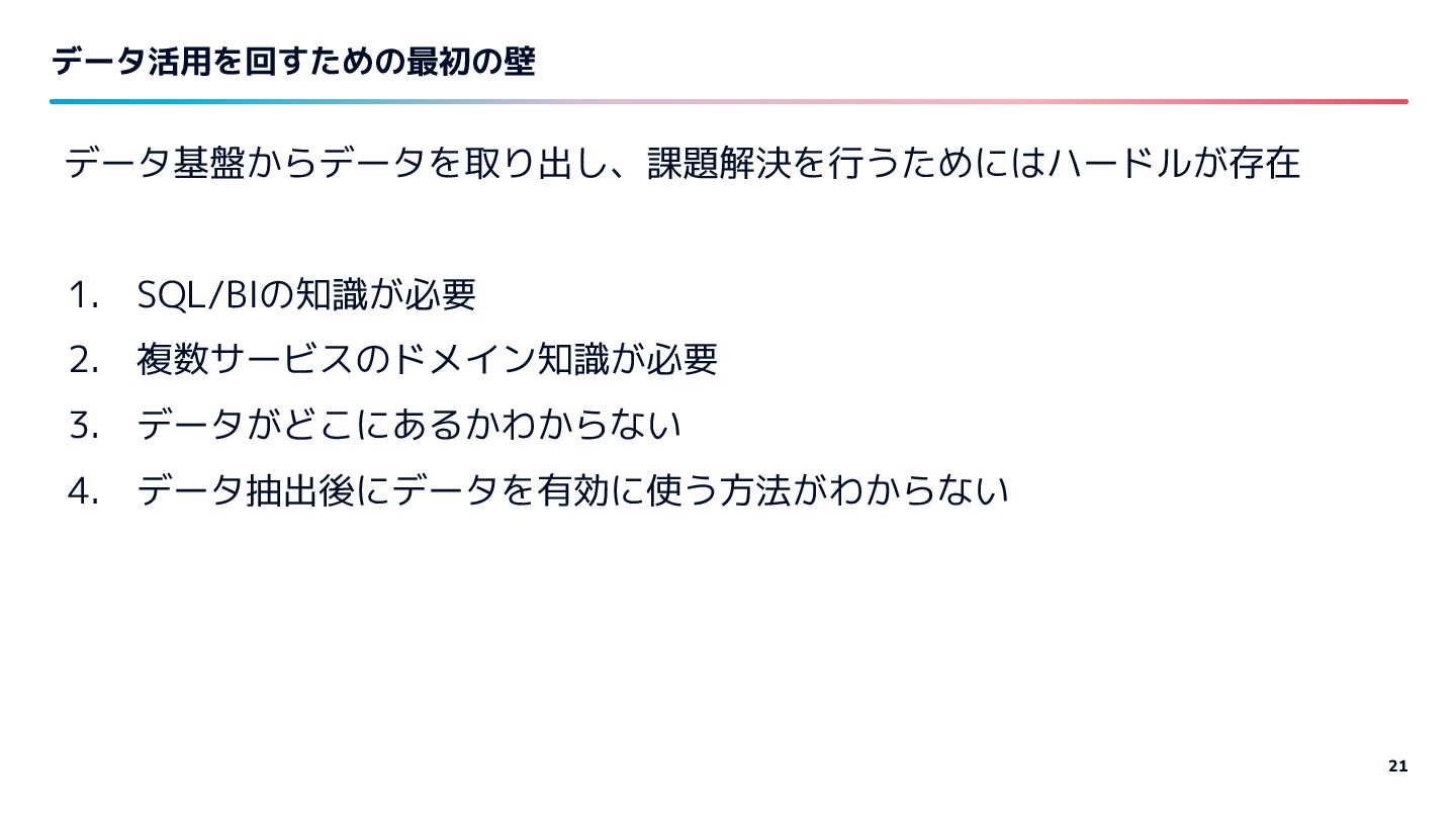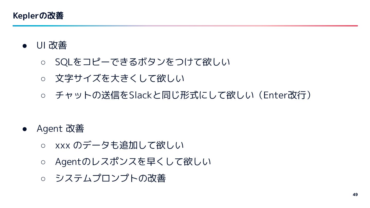 登壇前日に社内にリリースしたデータ分析Agentについて AIが活躍しやすいデータ基盤にするために取り組んでいることについてお話ししました。