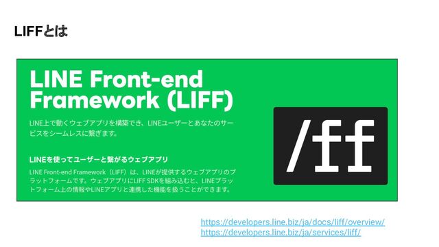 LIFFとは https://developers.line.biz/ja/docs/liff/overview/ https://developers.line.biz/ja/services/liff/