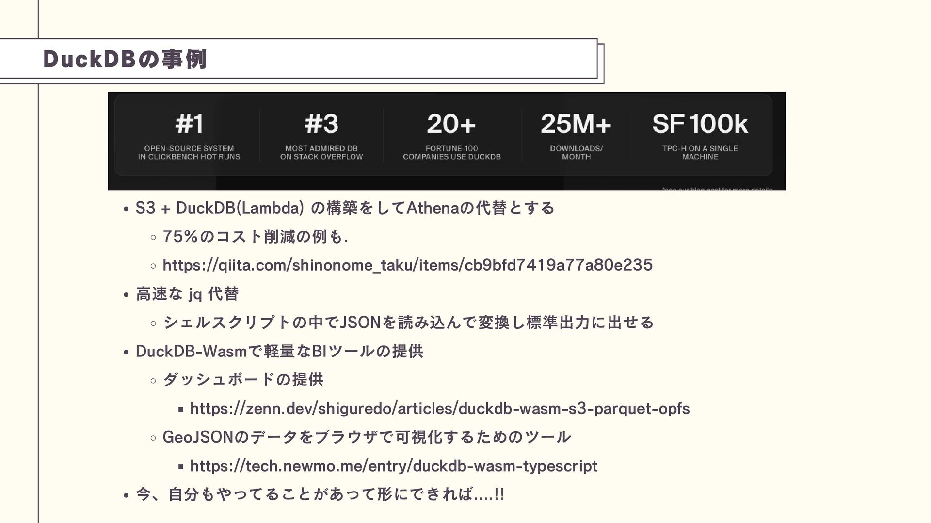 本セッションでは、DuckDBがデータ分析を再び高速で楽しいものにするというテーマのもと、その基本と高速分析の仕組み、S3代替や軽量BIツールとしての活用事例を深掘りします。