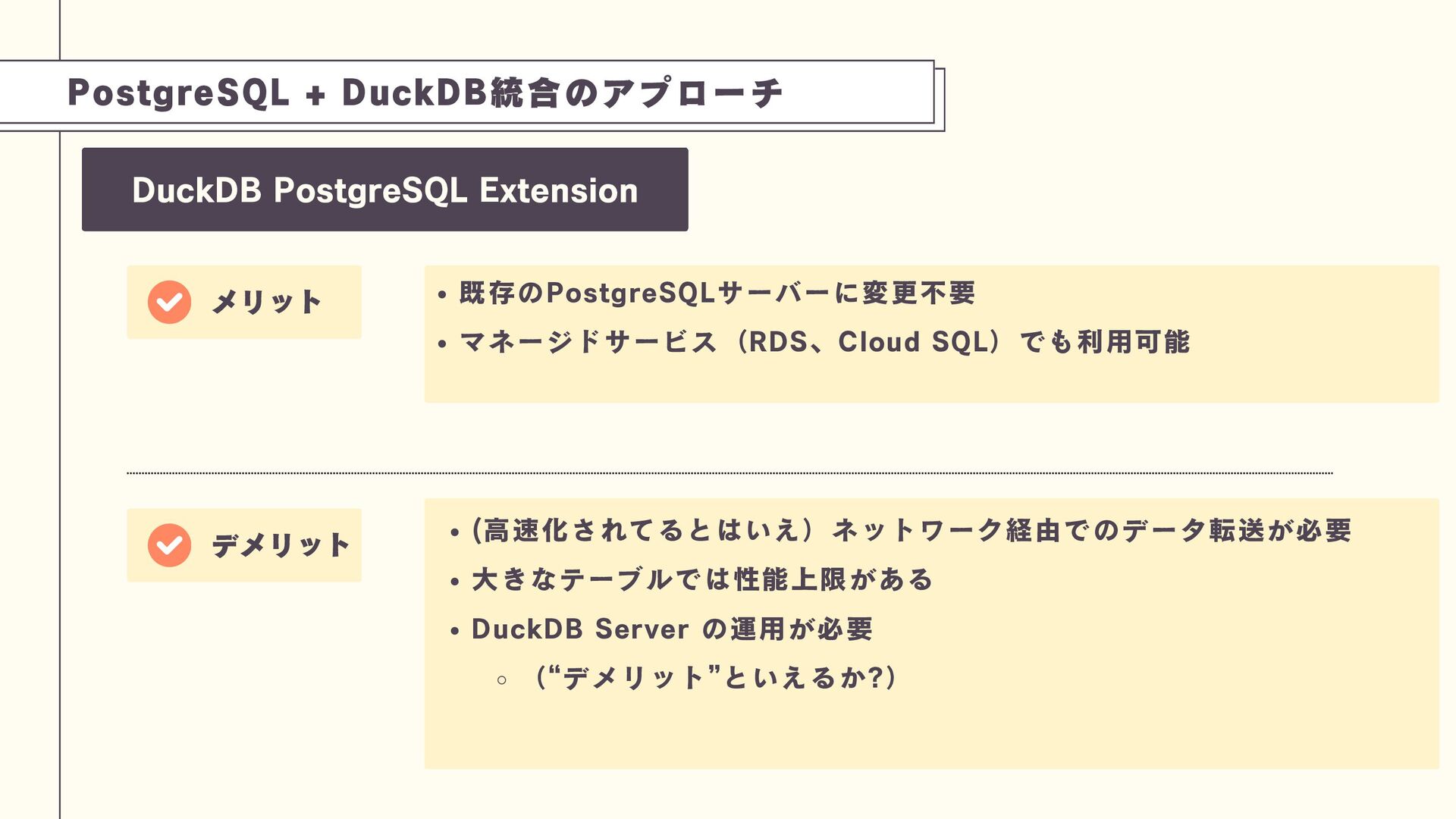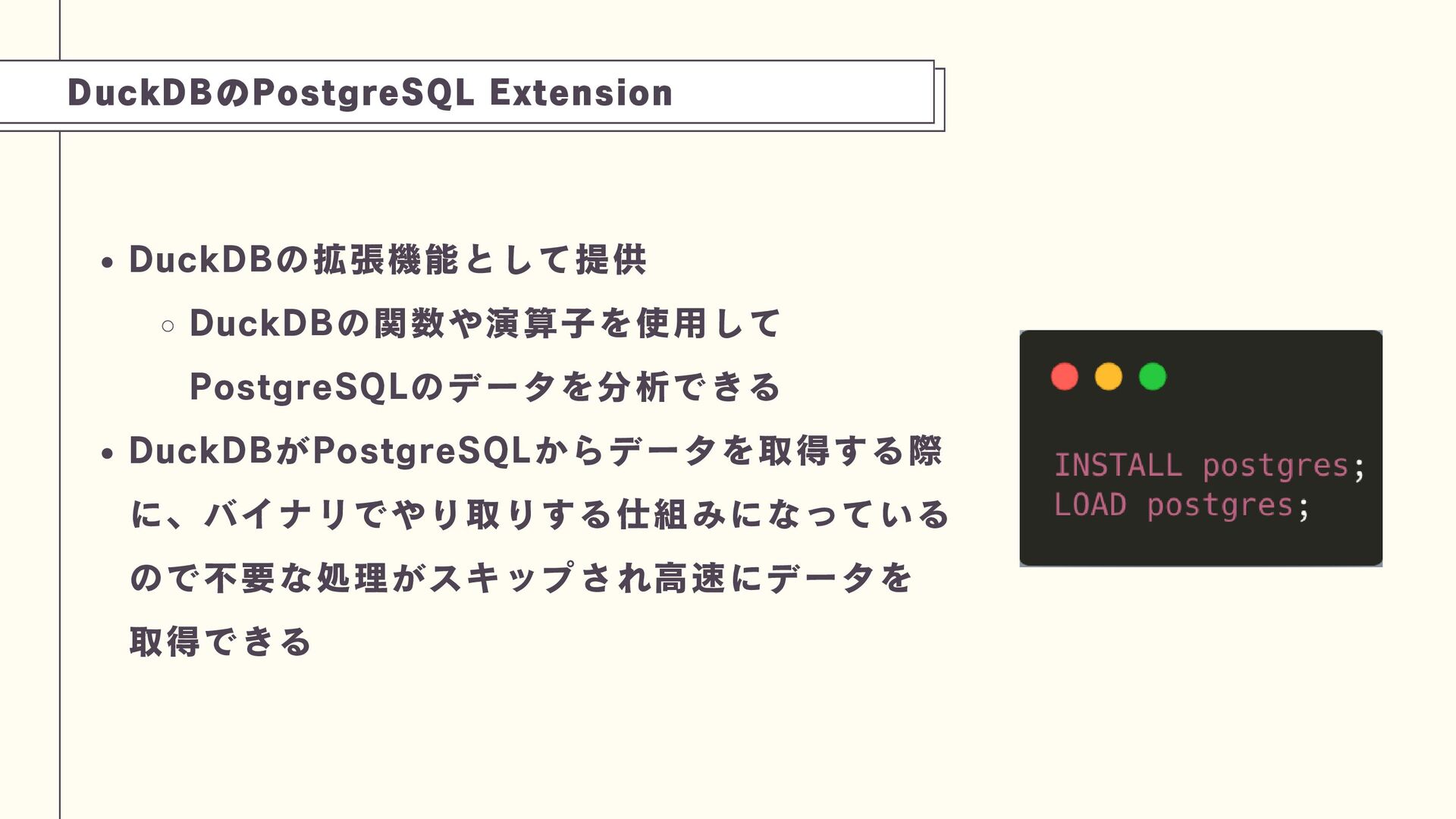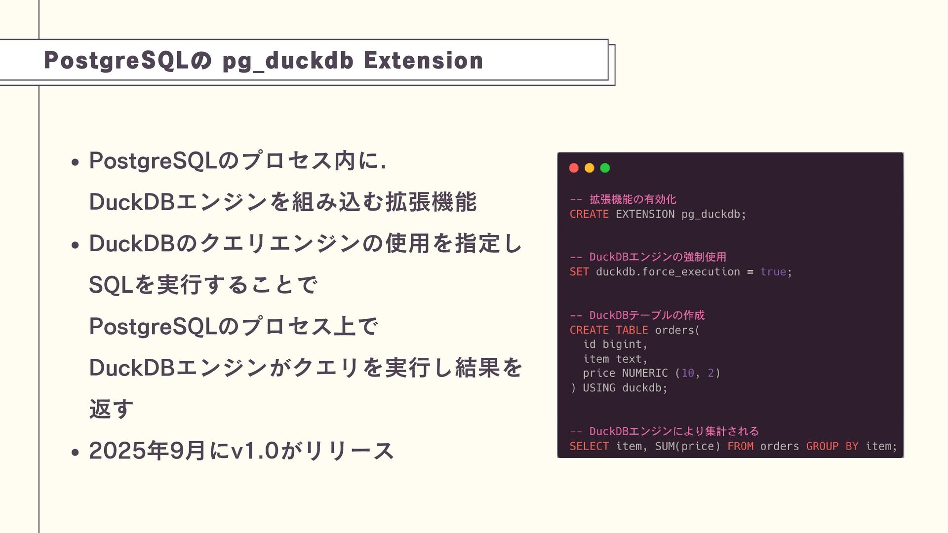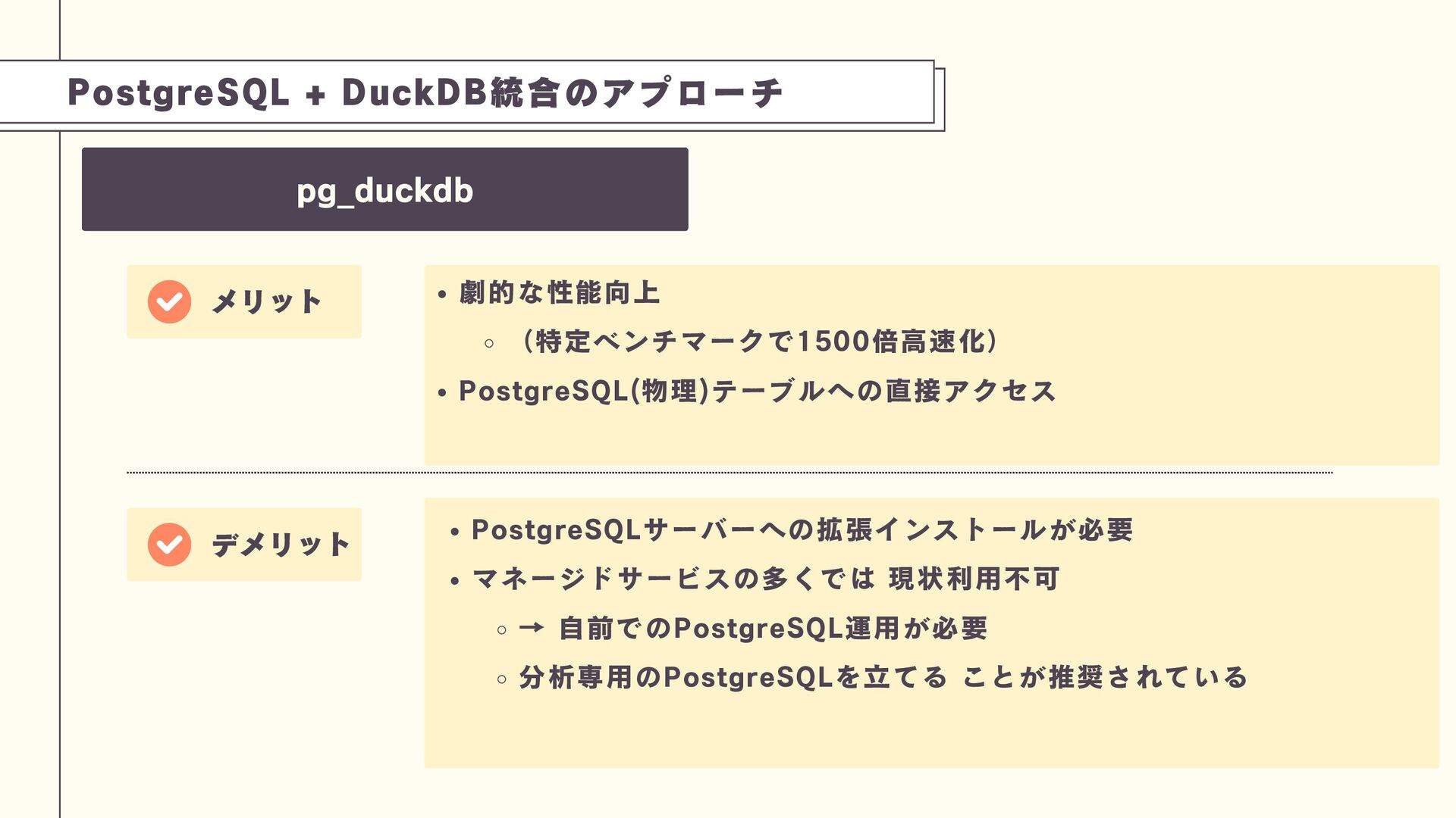 これは、PostgreSQLのプロセス内にDuckDBエンジンを組み込み、劇的な性能向上(特定ベンチマークで1500倍)を実現できるアプローチです。技術の特性を理解し、トップスピードでのデータ分析を実現する工夫を学びましょう。