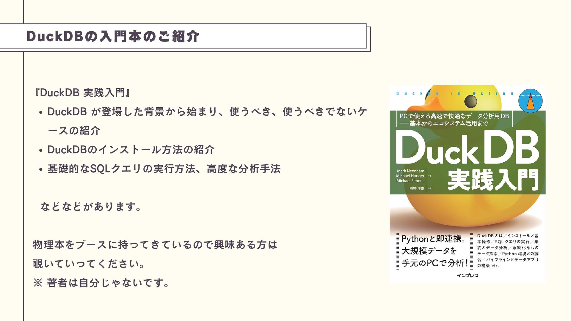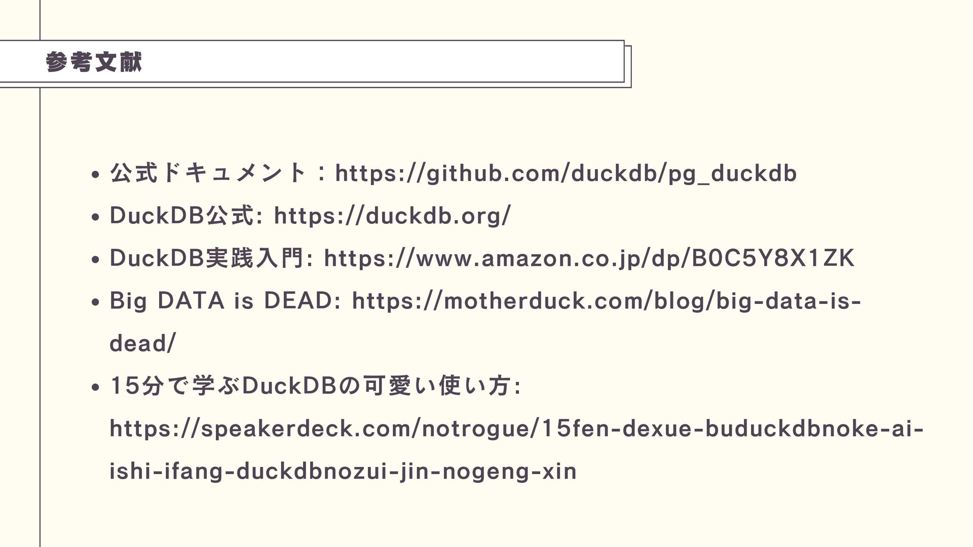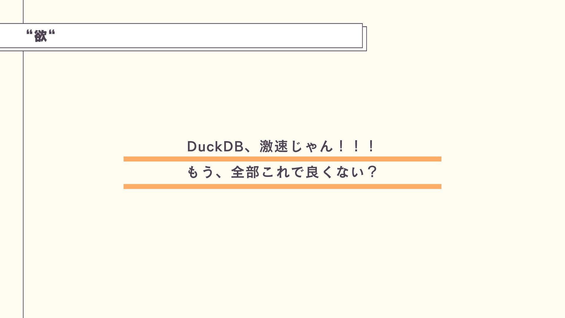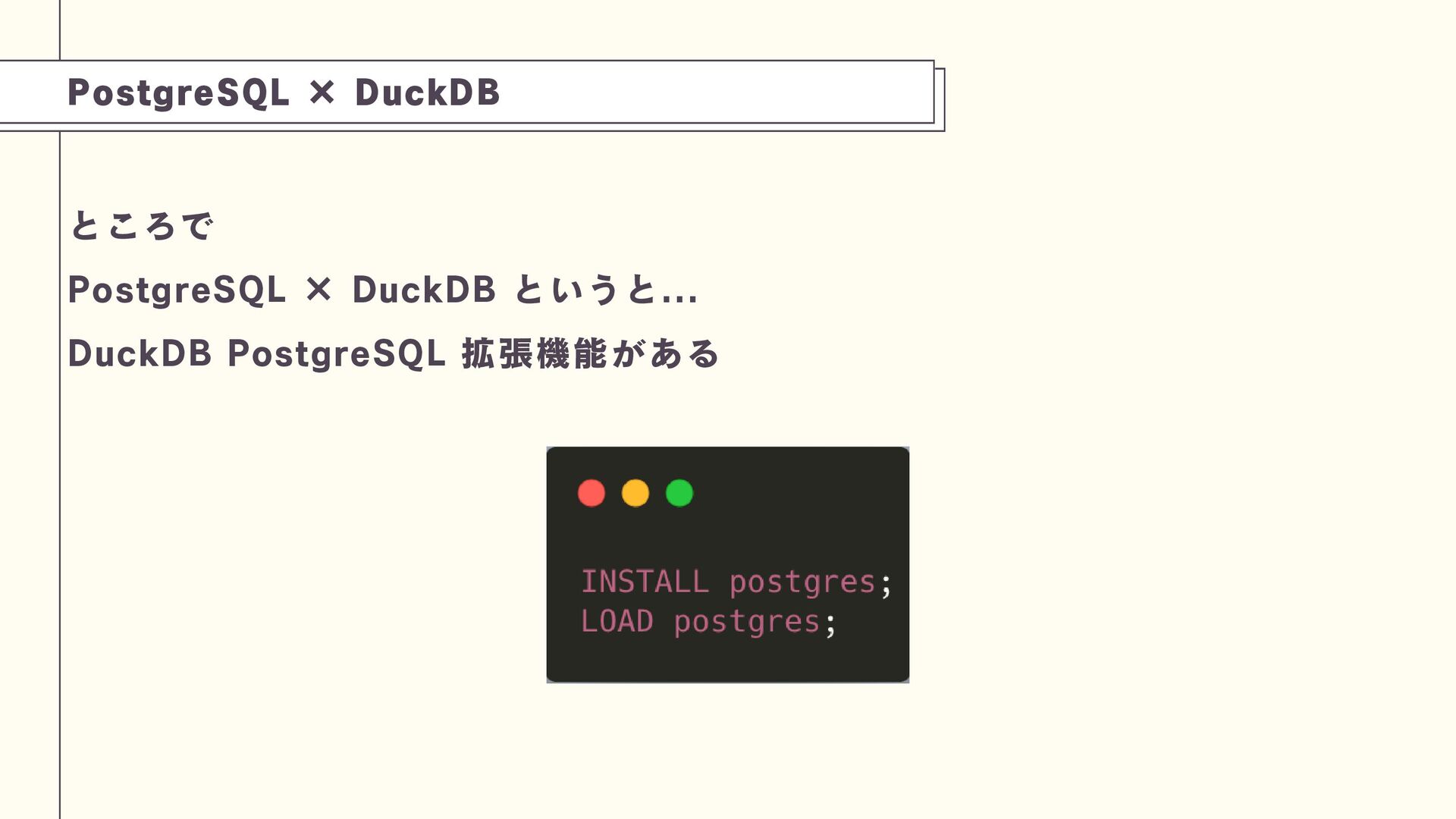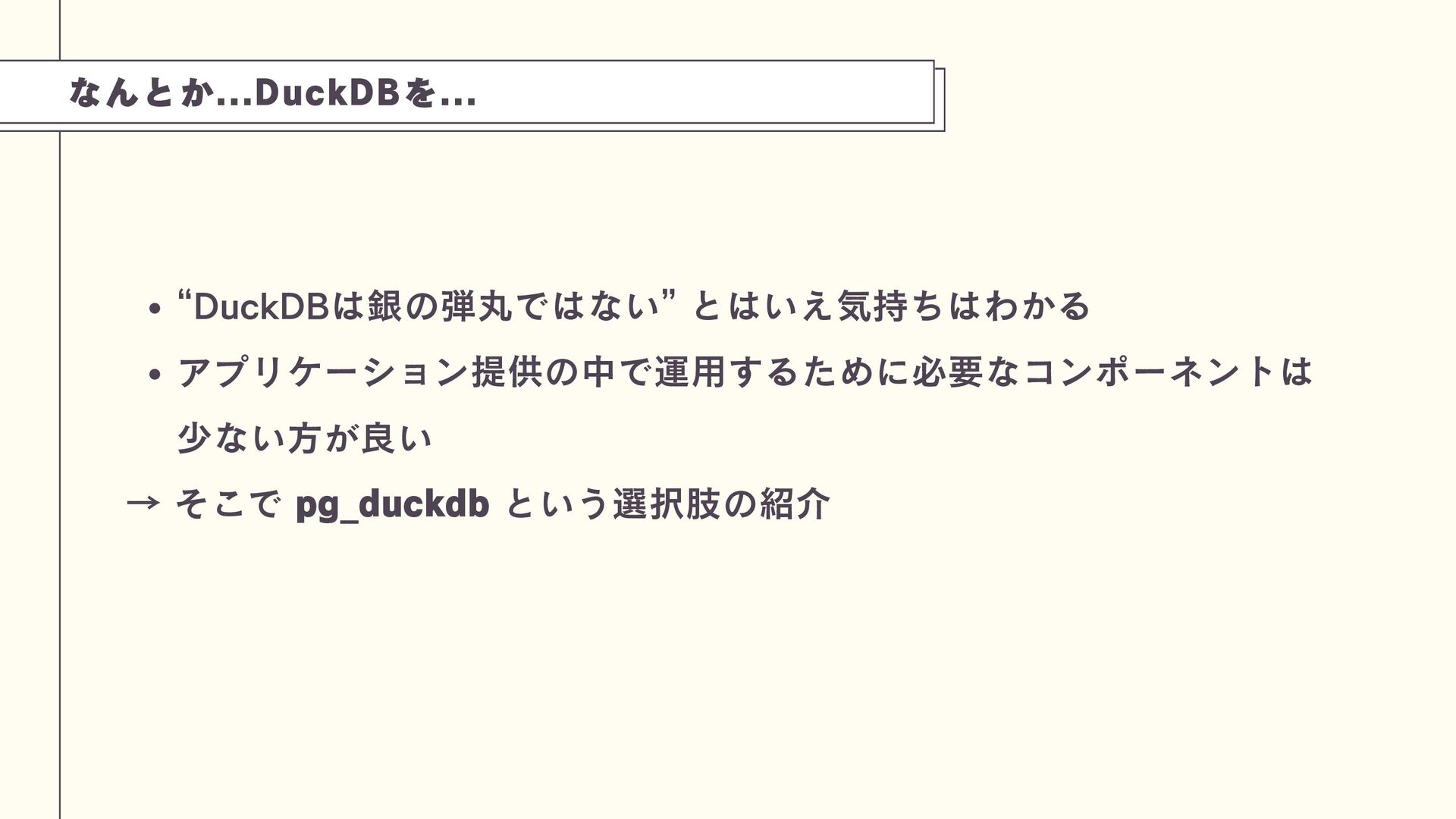 これは、PostgreSQLのプロセス内にDuckDBエンジンを組み込み、劇的な性能向上(特定ベンチマークで1500倍)を実現できるアプローチです。技術の特性を理解し、トップスピードでのデータ分析を実現する工夫を学びましょう。