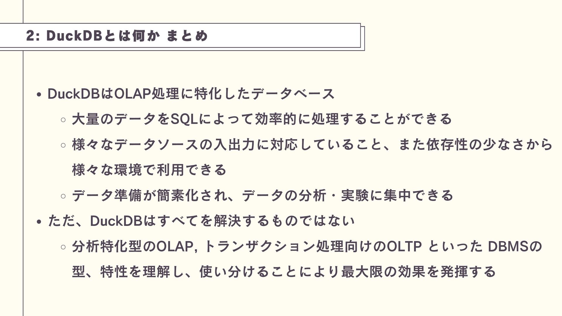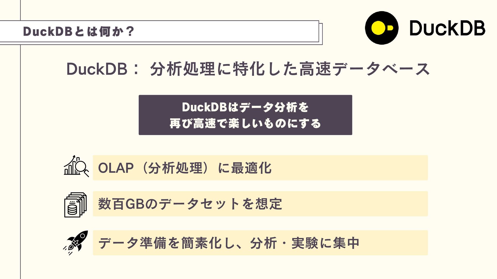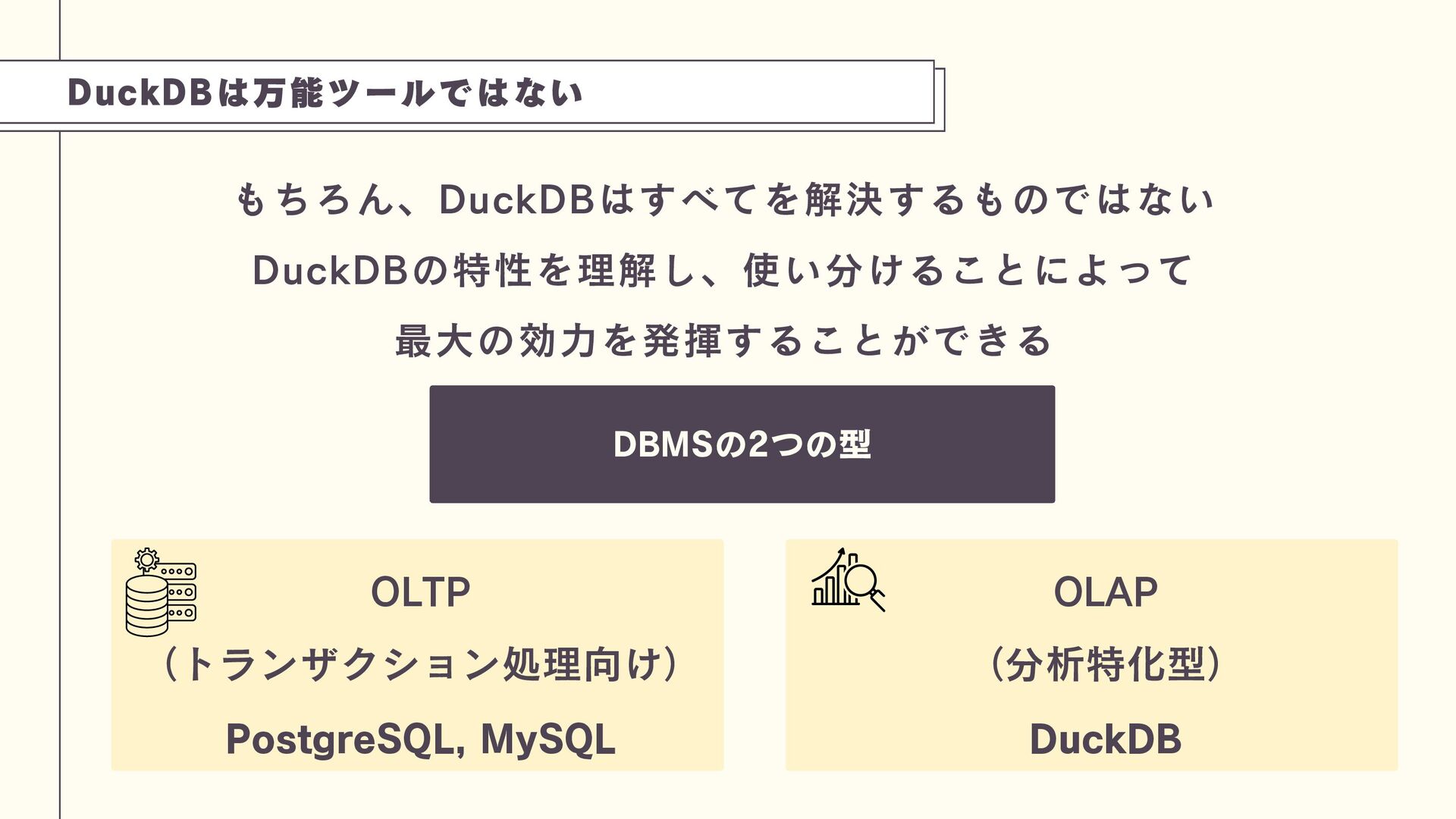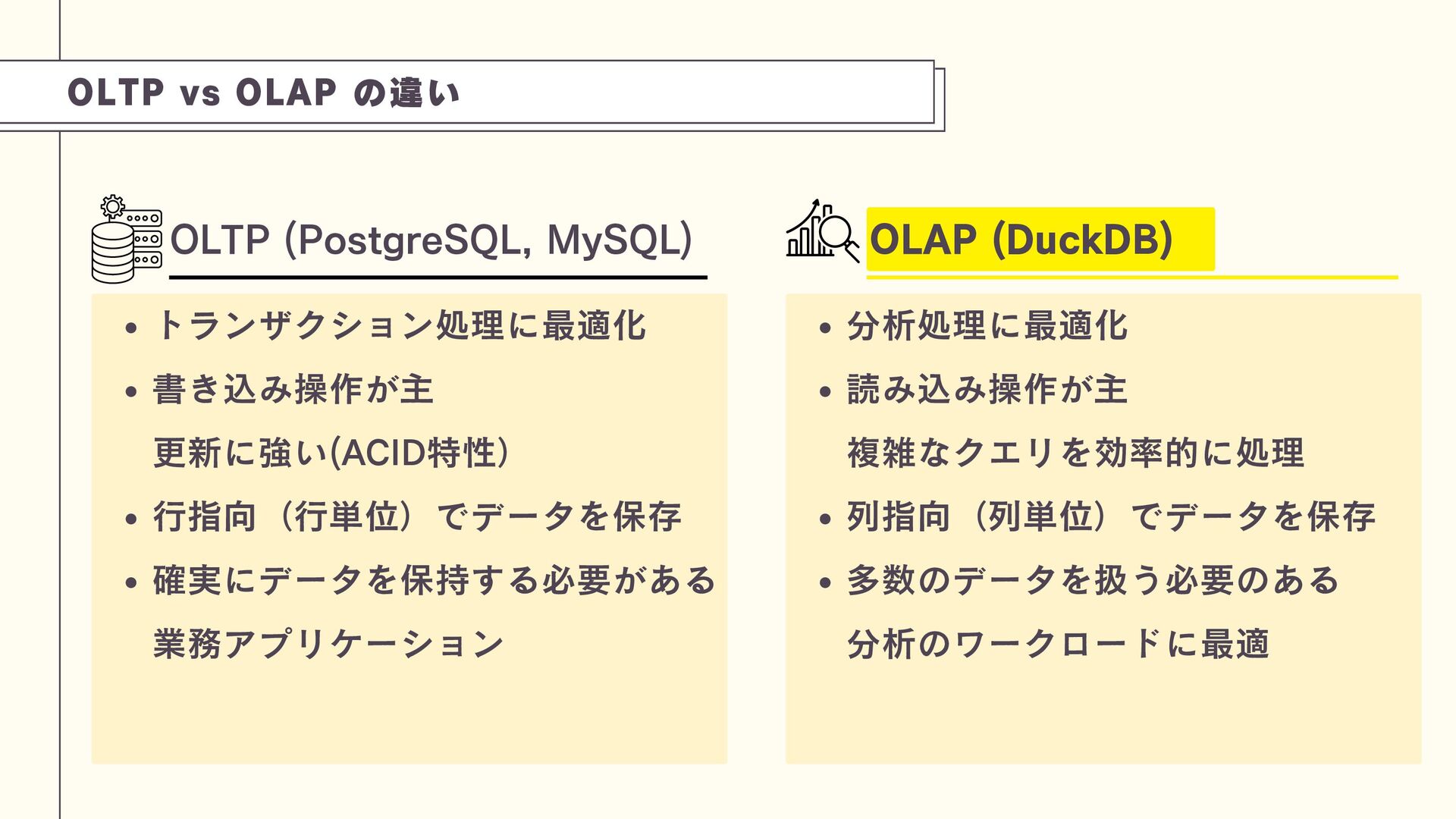 DuckDBは、PostgreSQL(OLTP)とは異なり、分析処理(OLAP)に特化した軽量な組み込み型データベースです。