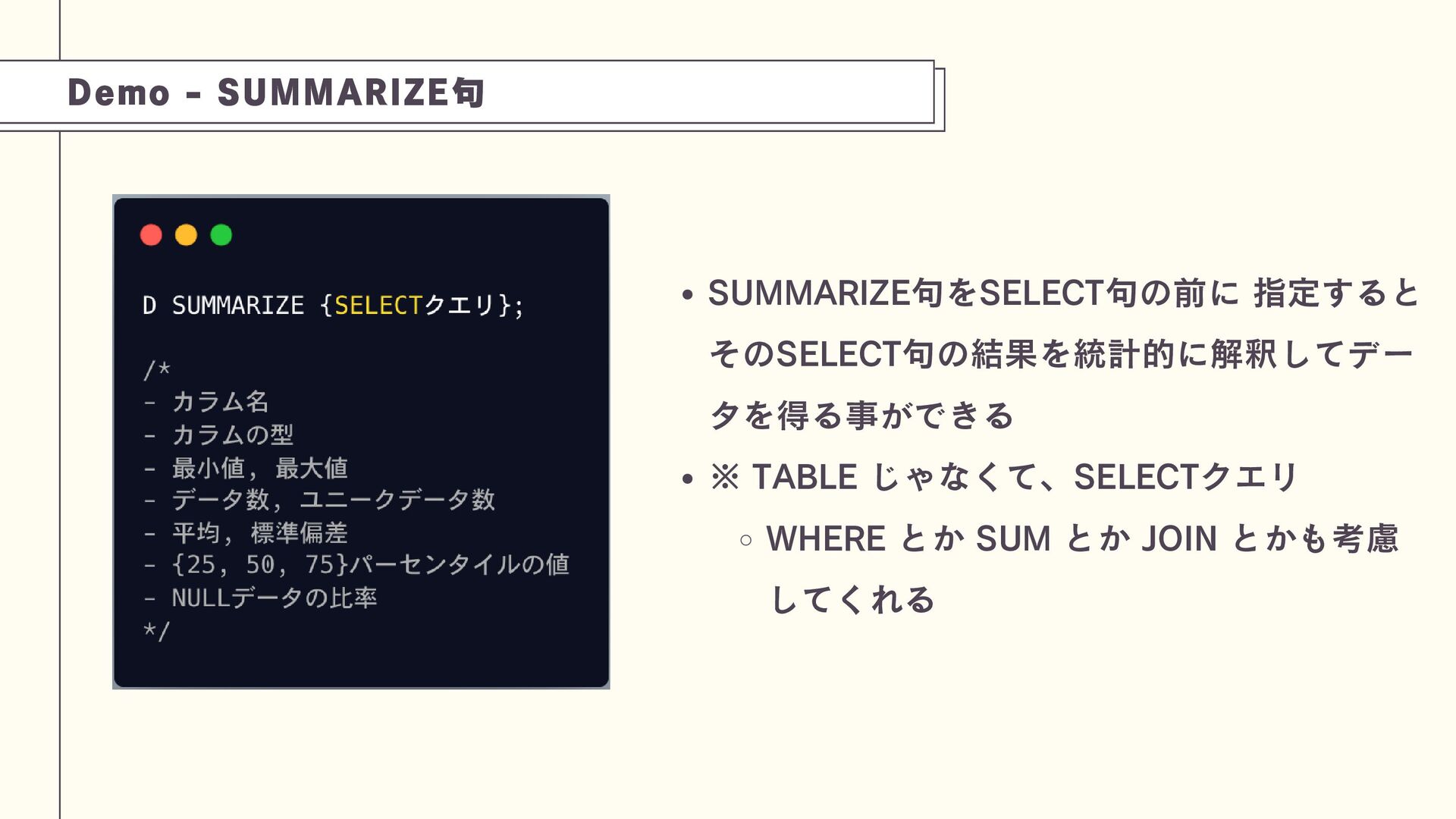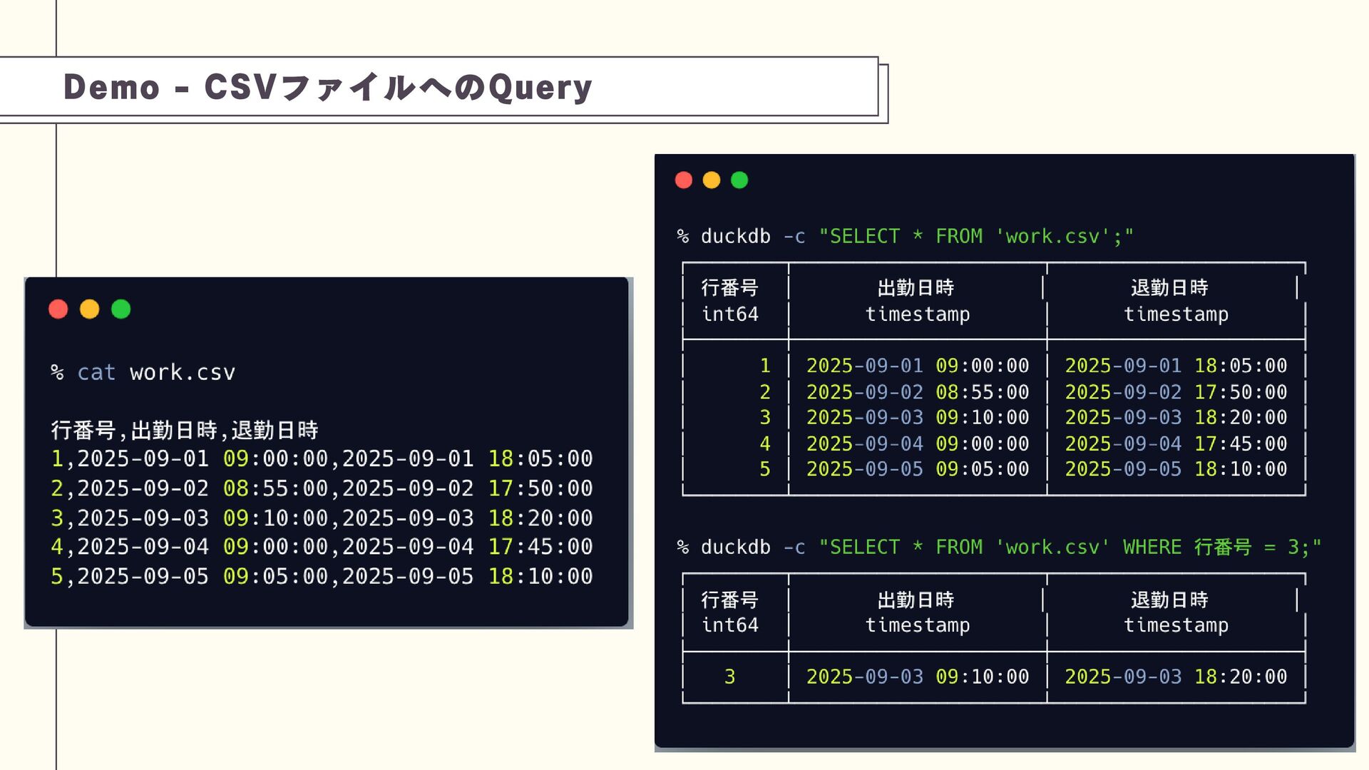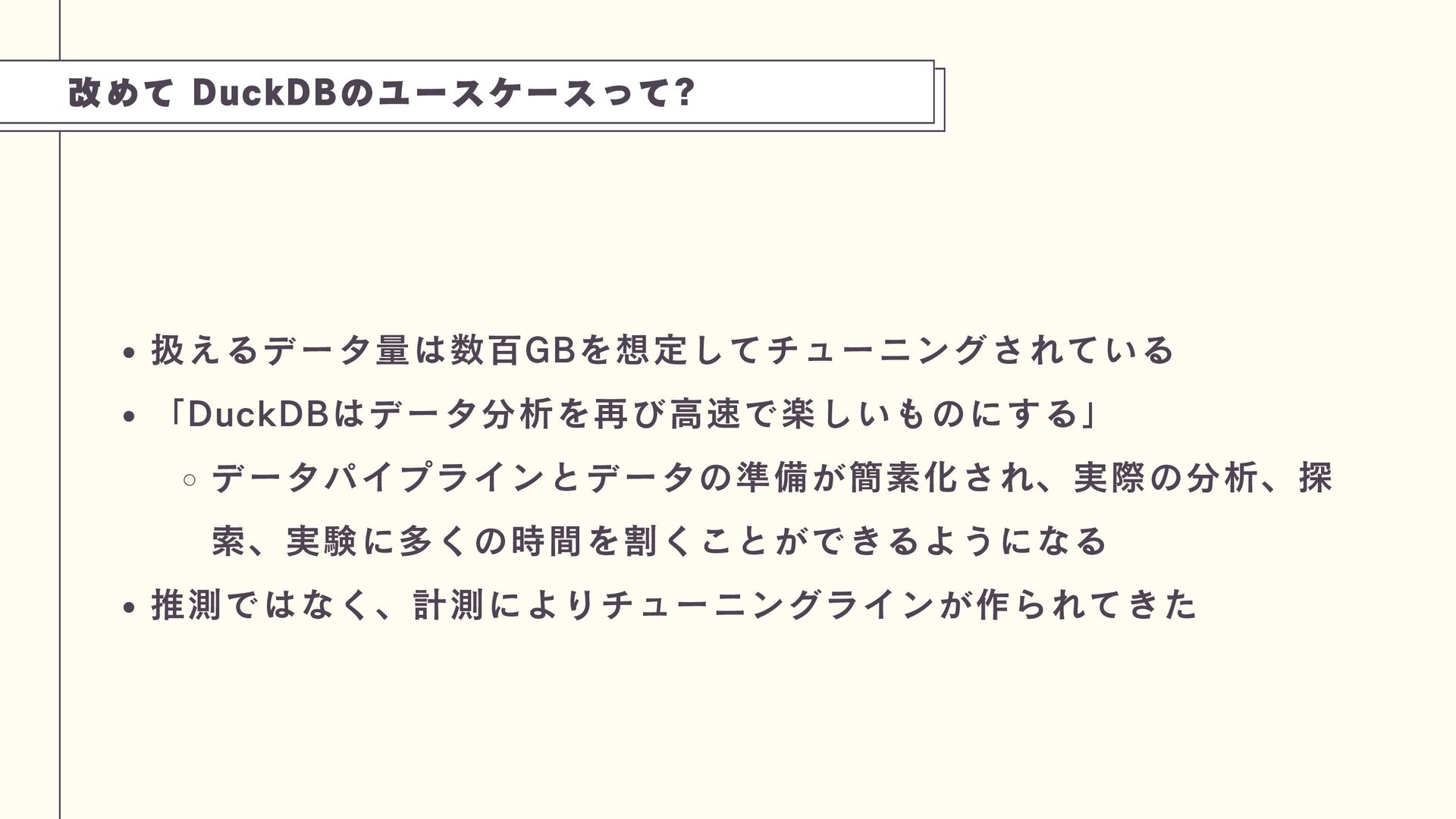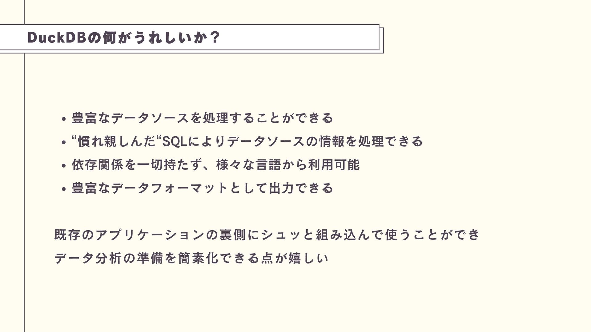 DuckDBは、PostgreSQL(OLTP)とは異なり、分析処理(OLAP)に特化した軽量な組み込み型データベースです。