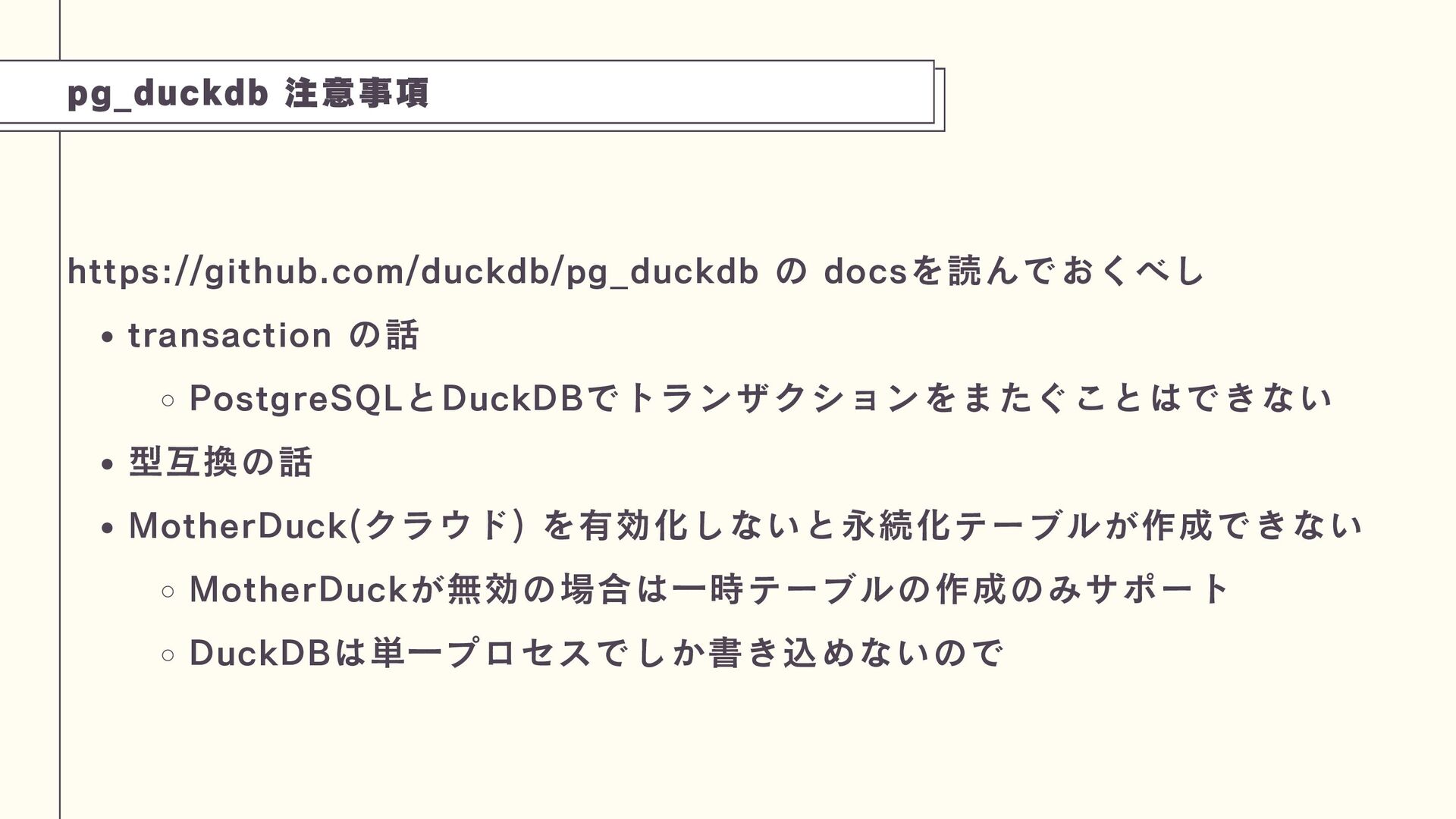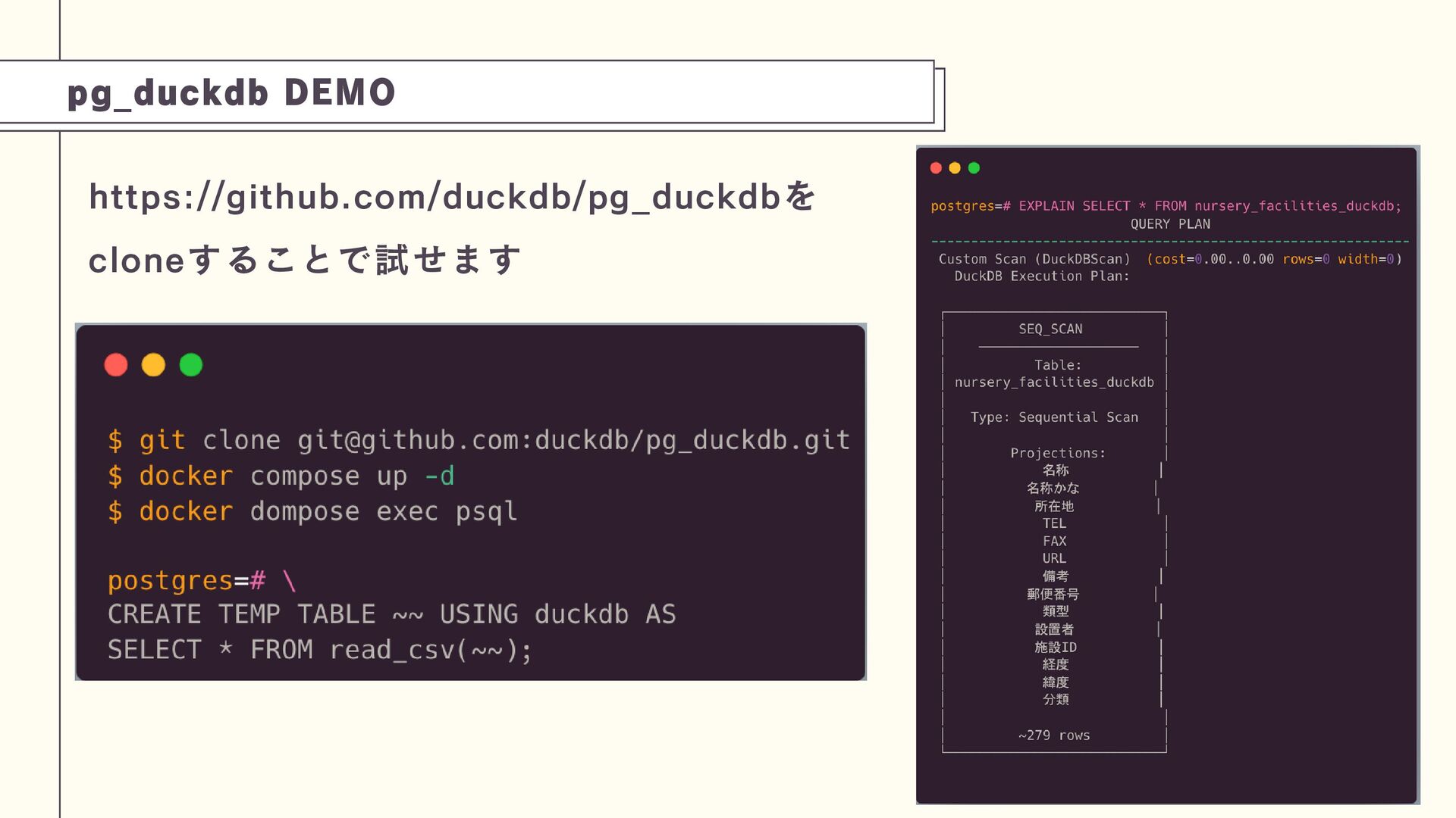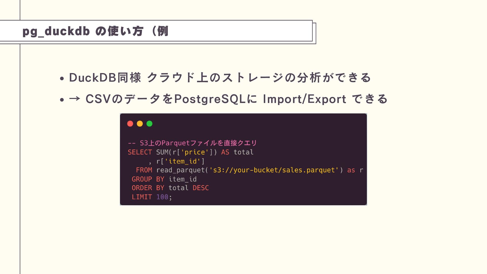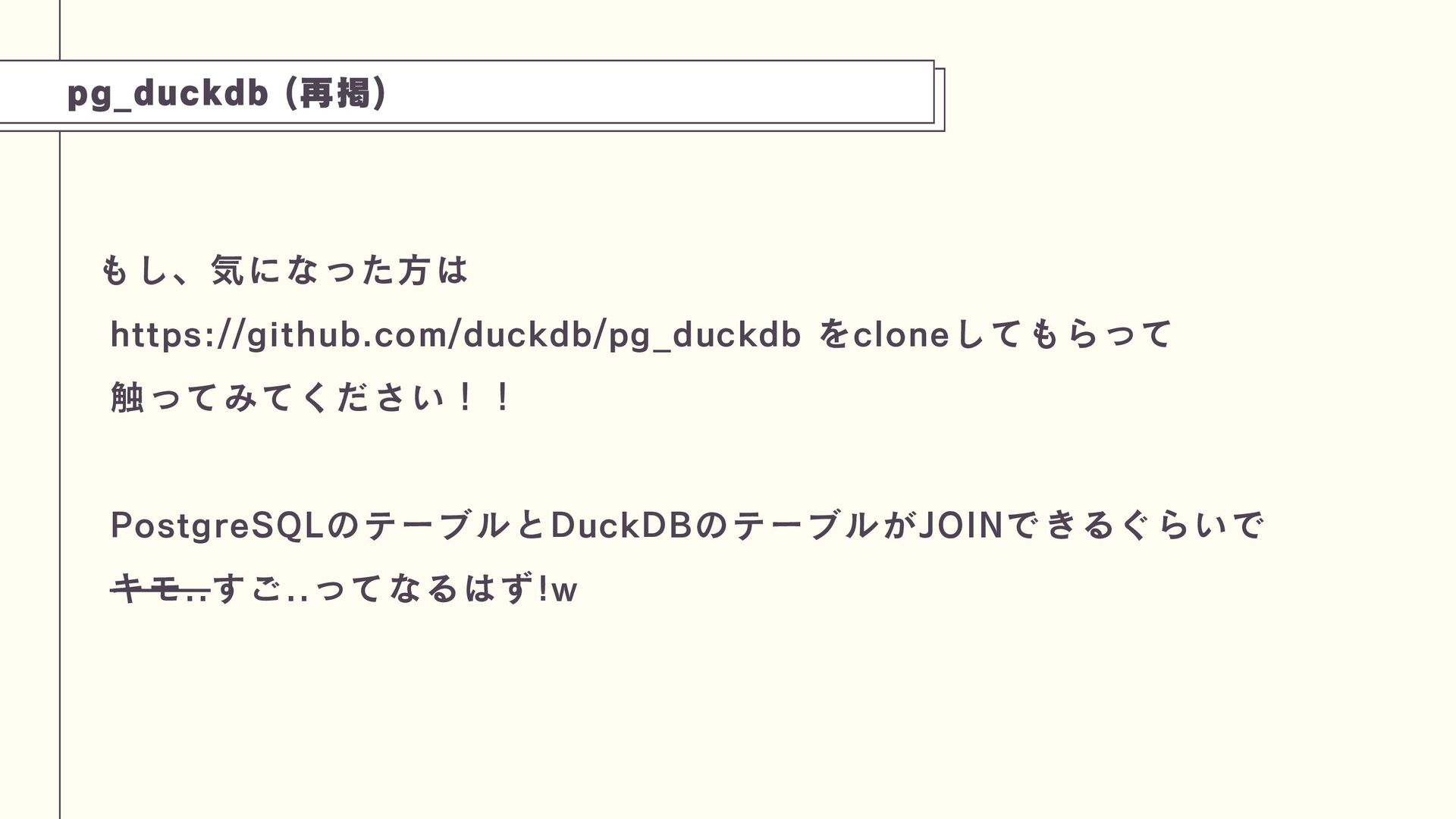 また、PostgreSQLの拡張機能pg_duckdbを紹介します。