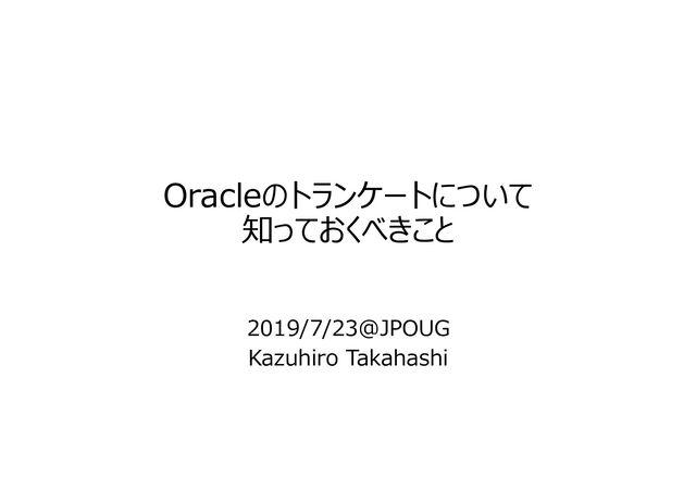 partition yyy update global indexes deferred invalidation 15 12c update ◆検証内容 • レンジパーティション+ローカル/グローバル索引のsales表に対しSQLを実行(フルスキャン・索引レンジスキャン) • パーティショントランケートをdeferred invalidationオプションあり・なしで確認(update global indexesあり) • v$sqlのinvalidation(無効化された回数)、last_load_time(前回ハードパースの時刻)に着目 CREATE TABLE scott.sales ( prod_id NUMBER(6) , cust_id NUMBER , time_id DATE , channel_id CHAR(1) , promo_id NUMBER(6) , quantity_sold NUMBER(3) , amount_sold NUMBER(10,2) ) PARTITION BY RANGE (time_id) ( PARTITION sales_q1_2006 VALUES LESS THAN (TO_DATE('20060401','YYYYMMDD')) , PARTITION sales_q2_2006 VALUES LESS THAN (TO_DATE('20060701','YYYYMMDD')) , PARTITION sales_q3_2006 VALUES LESS THAN (TO_DATE('20061001','YYYYMMDD')) , PARTITION sales_q4_2006 VALUES LESS THAN (TO_DATE('20061201','YYYYMMDD')) ); insert into scott.sales values(1,1,to_date('20060101','YYYYMMDD'),'1',1,1,1); insert into scott.sales values(2,1,to_date('20060401','YYYYMMDD'),'1',1,1,1); insert into scott.sales values(3,1,to_date('20060701','YYYYMMDD'),'1',1,1,1); insert into scott.sales values(4,1,to_date('20061001','YYYYMMDD'),'1',1,1,1); commit; create index scott.amount_sold_ix on scott.sales(amount_sold); create index scott.prod_id_ix on scott.sales(prod_id) local; SQL> select /* trunctest01 */ * from scott.sales; -------------------------------------------------------------------- | Id | Operation | Name | Rows | Bytes | Cost (% -------------------------------------------------------------------- | 0 | SELECT STATEMENT | | 328 | 25256 | 2 | 1 | PARTITION RANGE ALL | | 328 | 25256 | 2 | 2 | TABLE ACCESS STORAGE FULL| SALES | 328 | 25256 | 2 -------------------------------------------------------------------- SQL> select /* trunctest01 */ * from scott.sales where prod_id>0; -------------------------------------------------------------------- | Id | Operation | Name | Ro -------------------------------------------------------------------- | 0 | SELECT STATEMENT | | | 1 | PARTITION RANGE ALL | | | 2 | TABLE ACCESS BY LOCAL INDEX ROWID BATCHED| SALES | |* 3 | INDEX RANGE SCAN | PROD_ID_IX | -------------------------------------------------------------------- SQL> select /* trunctest01 */ * from scott.sales where amount_sold>0 -------------------------------------------------------------------- | Id | Operation | Name -------------------------------------------------------------------- | 0 | SELECT STATEMENT | | 1 | TABLE ACCESS BY GLOBAL INDEX ROWID BATCHED| SALES |* 2 | INDEX RANGE SCAN | AMOUNT_SOLD_IX -------------------------------------------------------------------- ローカル索引 グローバル索引