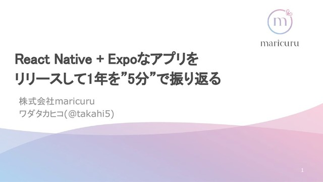 React Native + Expoなアプリを リリースして1年を”5分”で振り返る 株式会社maricuru ワダタカヒコ(@takahi5) 1