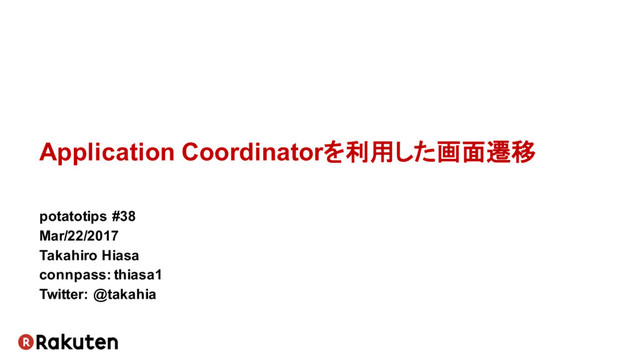 Application Coordinatorを利用した画面遷移 potatotips #38 Mar/22/2017 Takahiro Hiasa connpass: thiasa1 Twitter: