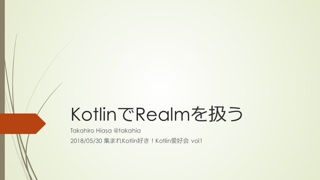 KotlinでRealmを扱う Takahiro Hiasa @takahia 2018/05/30 集まれKotlin好き!Kotlin愛好会 vol1
