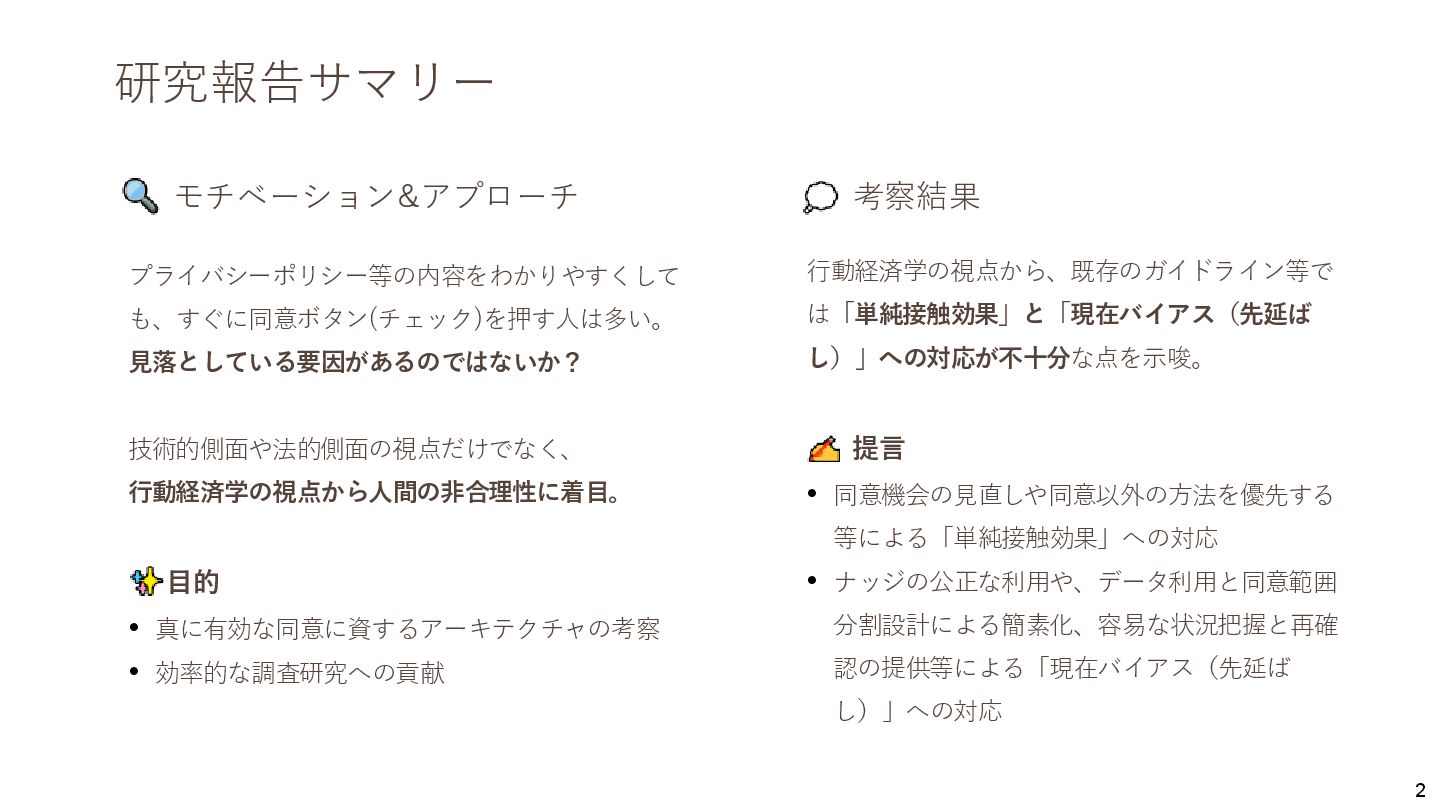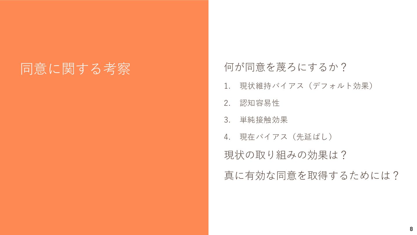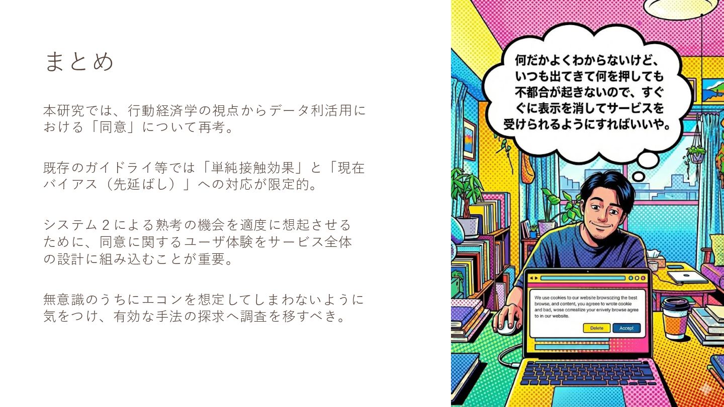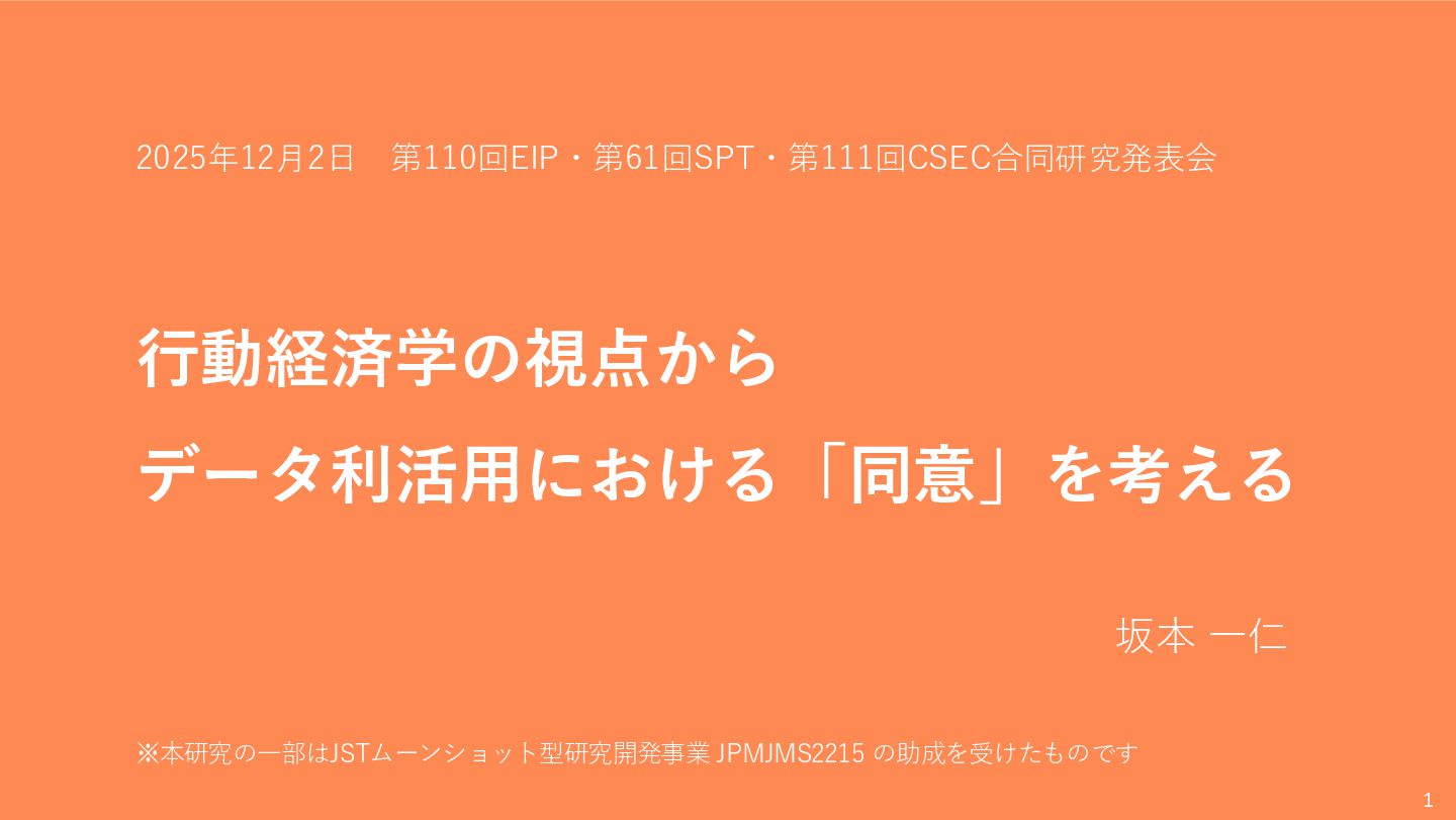 第110回EIP・第61回SPT・第111回CSEC合同研究発表会 https://www.ipsj.or.jp/kenkyukai/event/eip110spt61csec111.html タイトル「行動経済学の視点からデータ利活用における「同意」を考える」の発表スライドです。