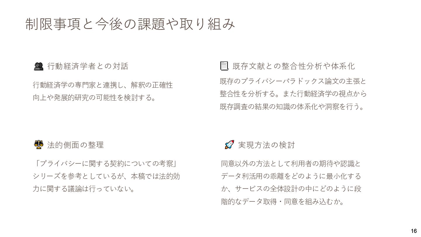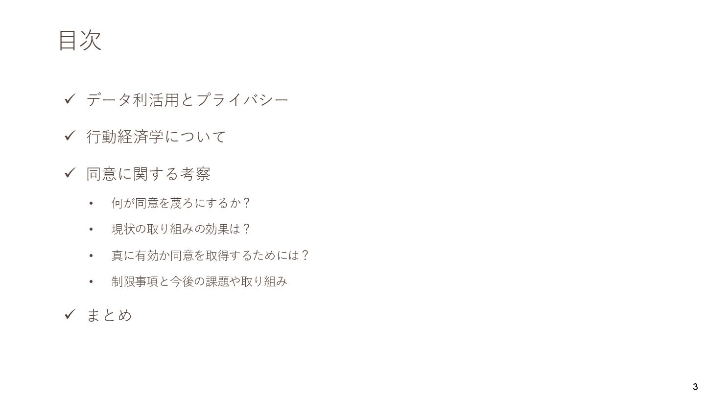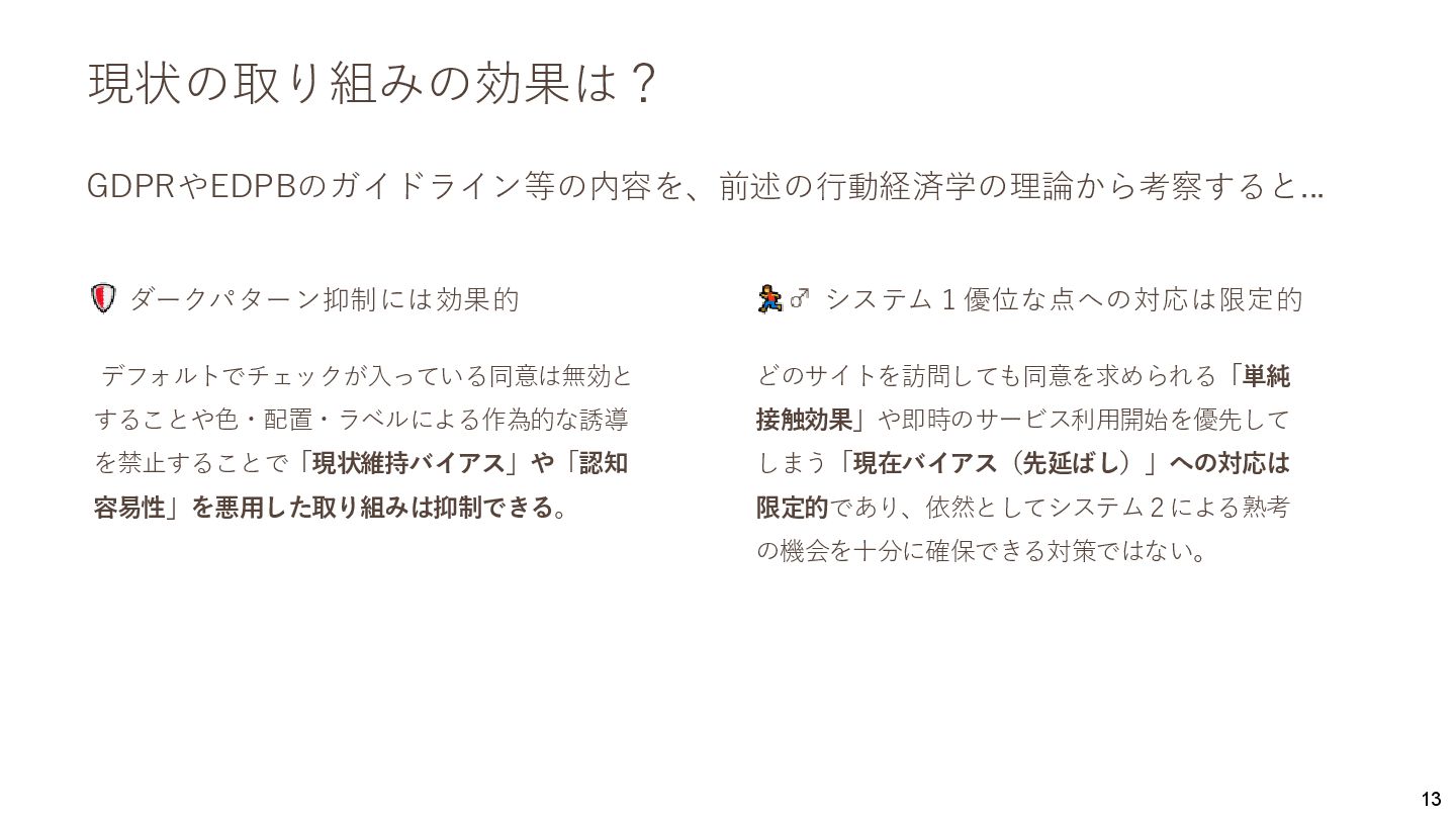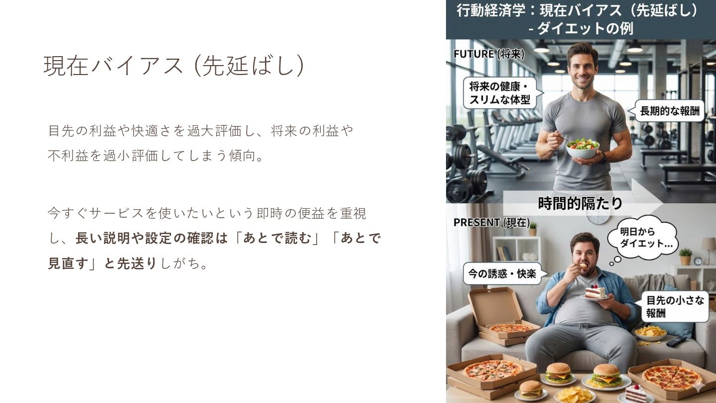 第110回EIP・第61回SPT・第111回CSEC合同研究発表会 https://www.ipsj.or.jp/kenkyukai/event/eip110spt61csec111.html タイトル「行動経済学の視点からデータ利活用における「同意」を考える」の発表スライドです。