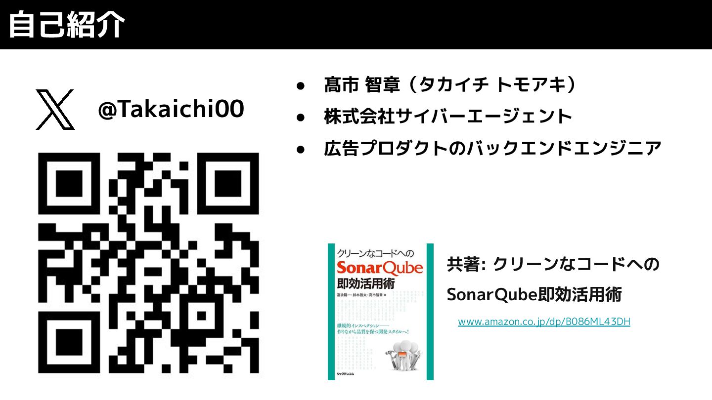 自己紹介 共著: クリーンなコードへの SonarQube即効活用術 www.amazon.co.jp/dp/B086ML43DH • 髙市 智章(タカイチ トモアキ) •