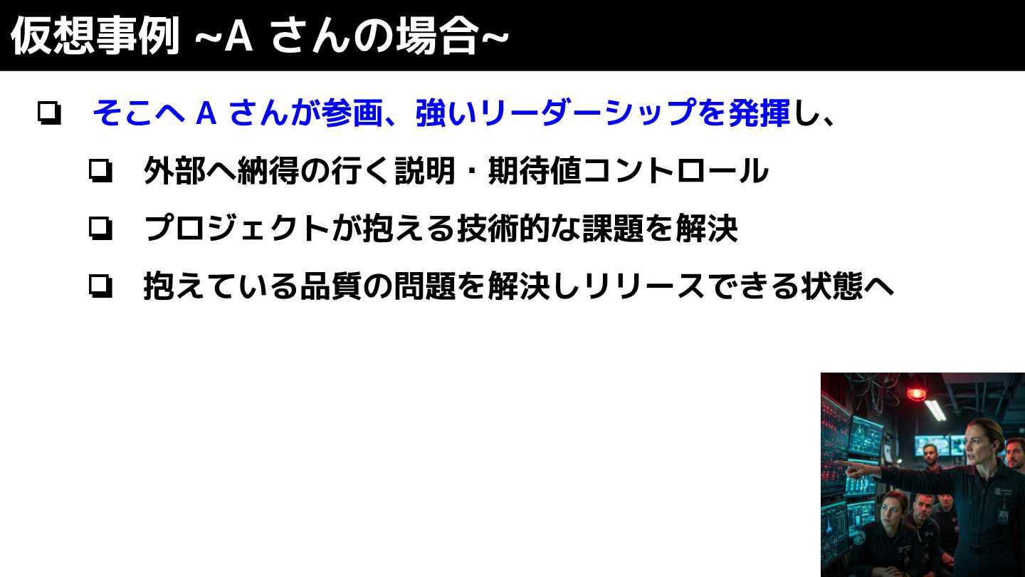 ❏ そこへ A さんが参画、強いリーダーシップを発揮し、 ❏ 外部へ納得の行く説明・期待値コントロール ❏ プロジェクトが抱える技術的な課題を解決 ❏ 抱えている品質の問題を解決しリリースできる状態へ