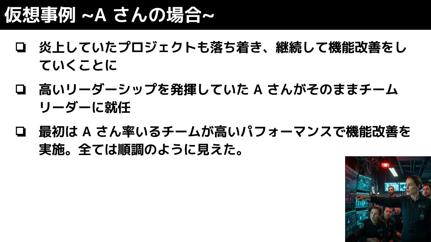 A さん率いるチームが高いパフォーマンスで機能改善を 実施。全ては順調のように見えた。 仮想事例 ~A さんの場合~