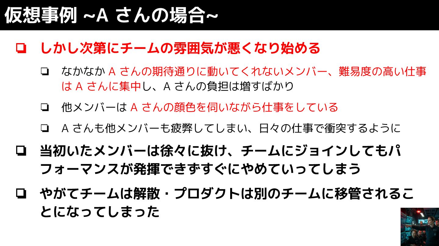 ❏ 他メンバーは A さんの顔色を伺いながら仕事をしている ❏ A さんも他メンバーも疲弊してしまい、日々の仕事で衝突するように ❏ 当初いたメンバーは徐々に抜け、チームにジョインしてもパ フォーマンスが発揮できずすぐにやめていってしまう ❏ やがてチームは解散・プロダクトは別のチームに移管されるこ とになってしまった 仮想事例 ~A さんの場合~