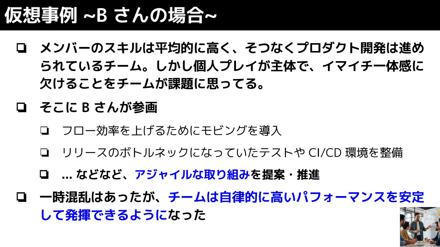 ❏ リリースのボトルネックになっていたテストや CI/CD 環境を整備 ❏ ... などなど、アジャイルな取り組みを提案・推進 ❏ 一時混乱はあったが、チームは自律的に高いパフォーマンスを安定 して発揮できるようになった 仮想事例 ~B さんの場合~