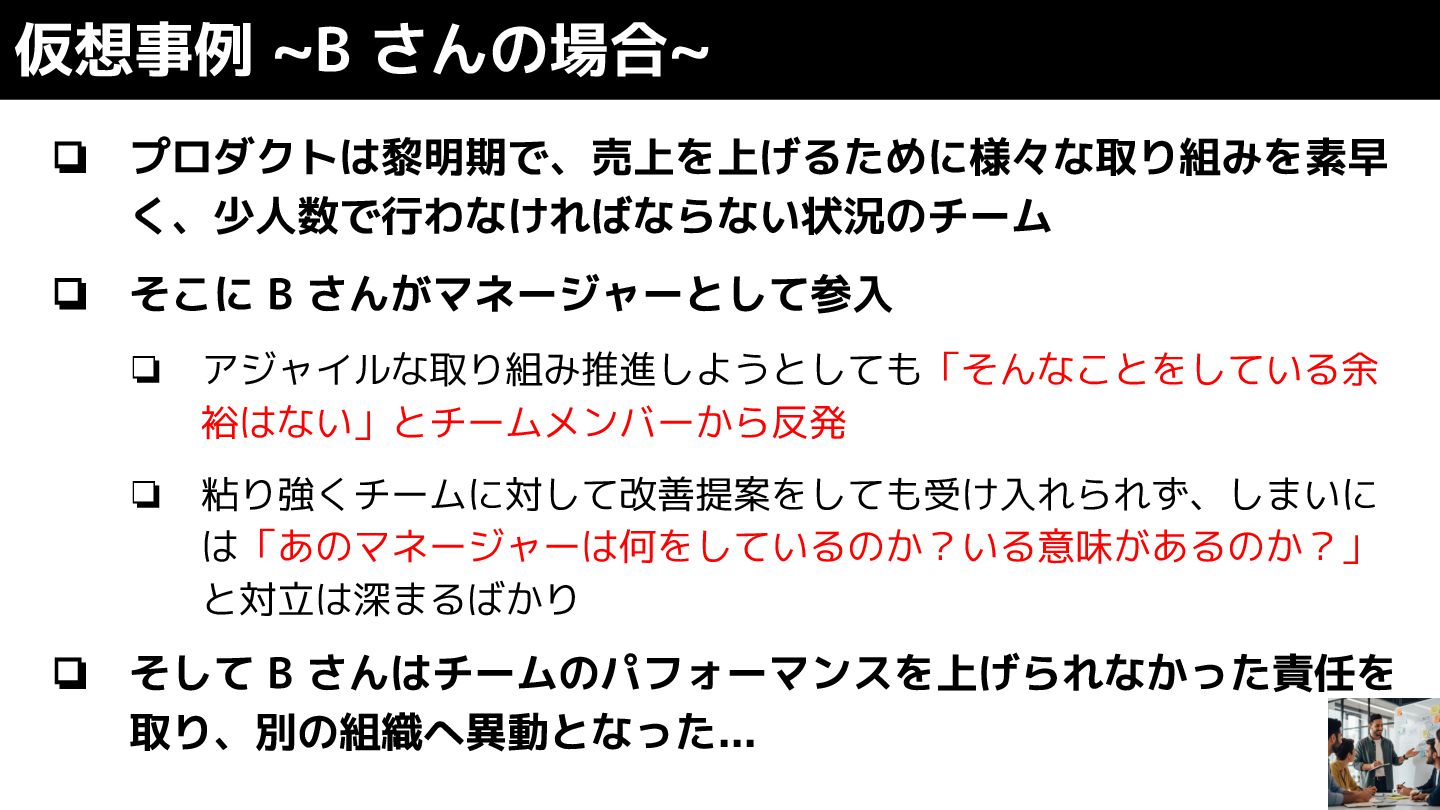❏ 粘り強くチームに対して改善提案をしても受け入れられず、しまいに は「あのマネージャーは何をしているのか?いる意味があるのか?」 と対立は深まるばかり ❏ そして B さんはチームのパフォーマンスを上げられなかった責任を 取り、別の組織へ異動となった... 仮想事例 ~B さんの場合~