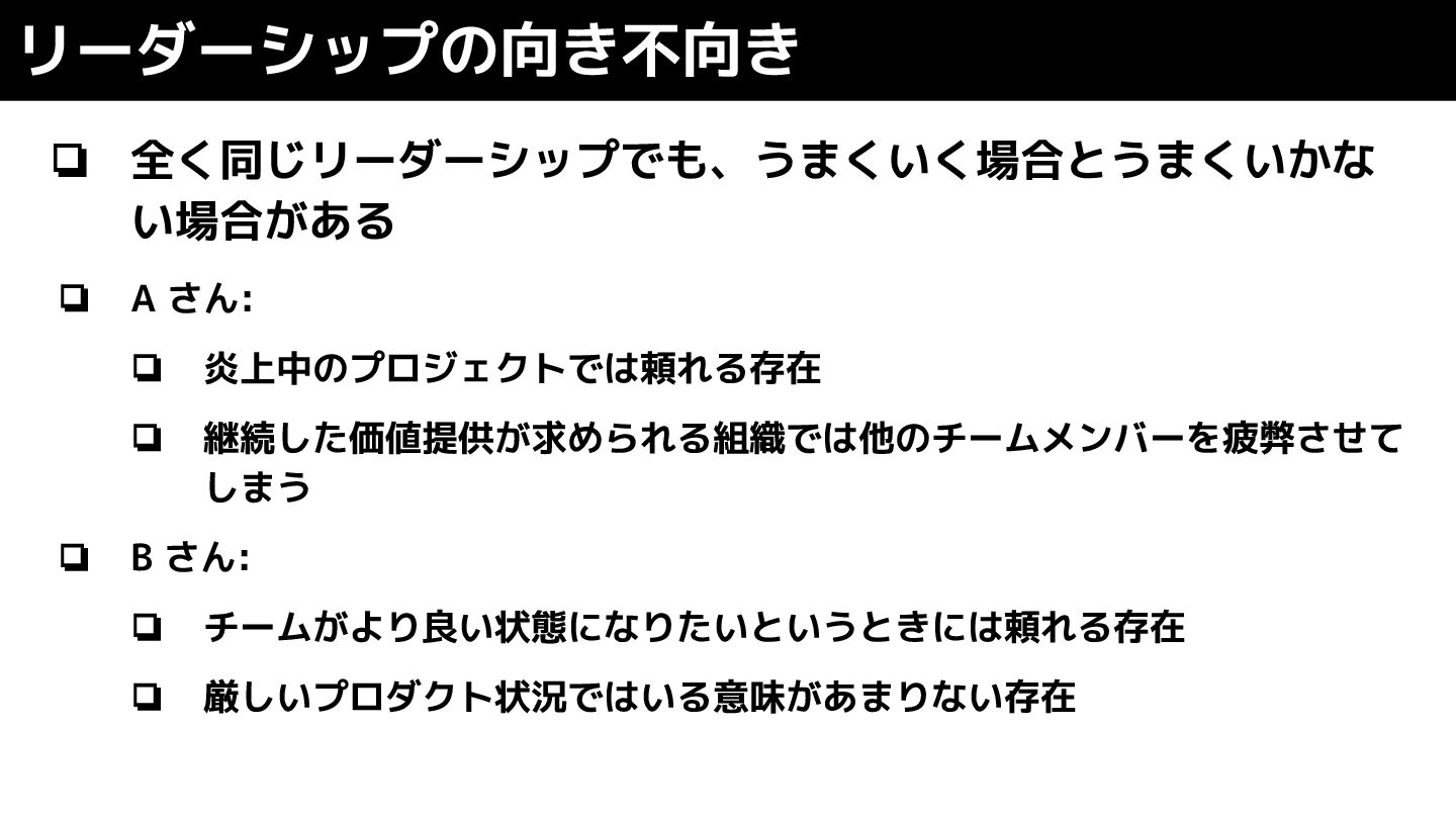 ❏ 全く同じリーダーシップでも、うまくいく場合とうまくいかな い場合がある ❏ A さん: ❏ 炎上中のプロジェクトでは頼れる存在 ❏ 継続した価値提供が求められる組織では他のチームメンバーを疲弊させて