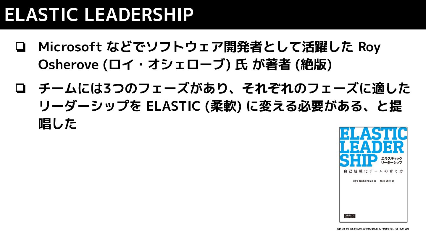 チームには3つのフェーズがあり、それぞれのフェーズに適した リーダーシップを ELASTIC (柔軟) に変える必要がある、と提 唱した ELASTIC LEADERSHIP https://m.media-amazon.com/images/I/710YEQbMvZL._SL1500_.jpg