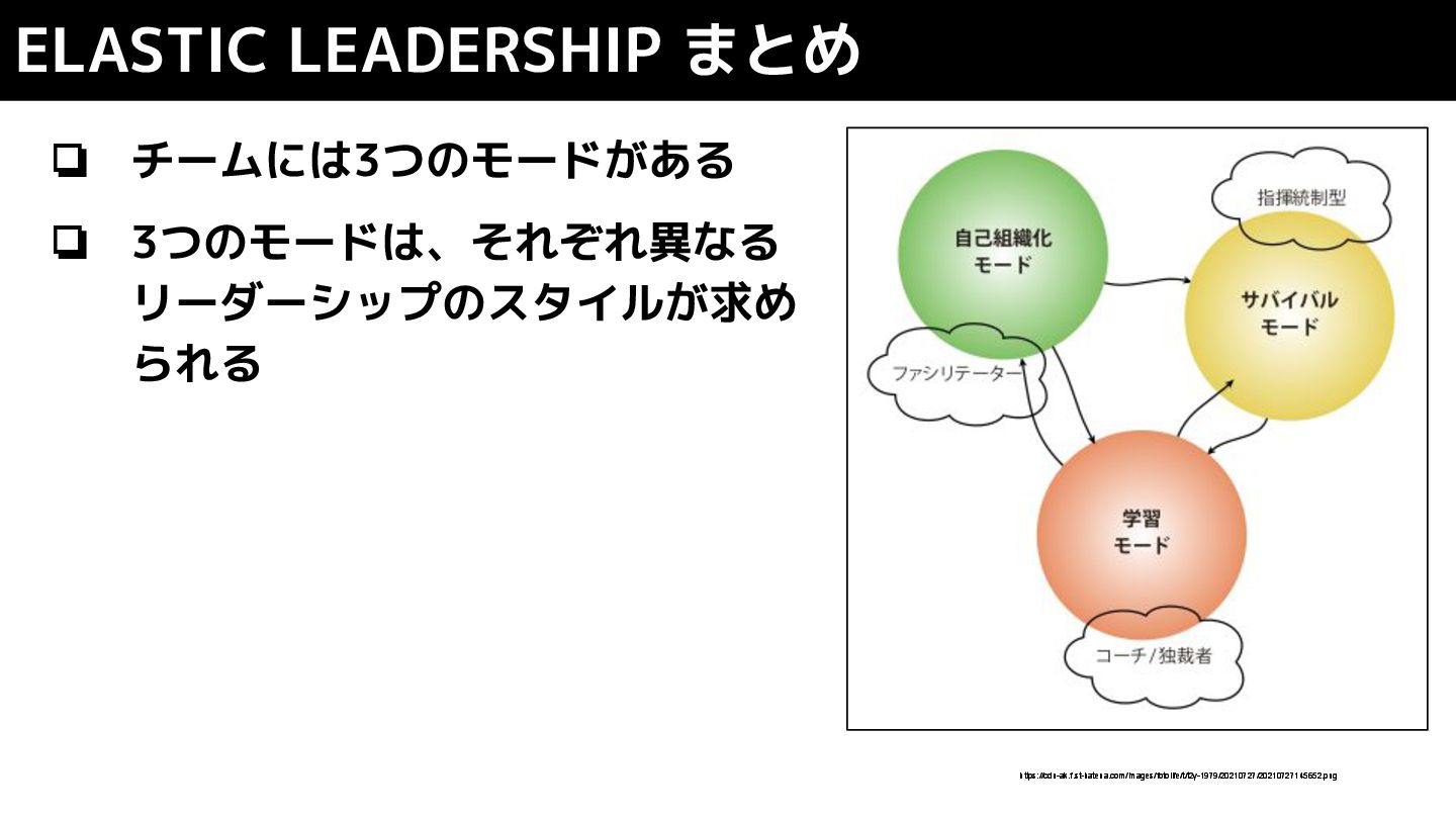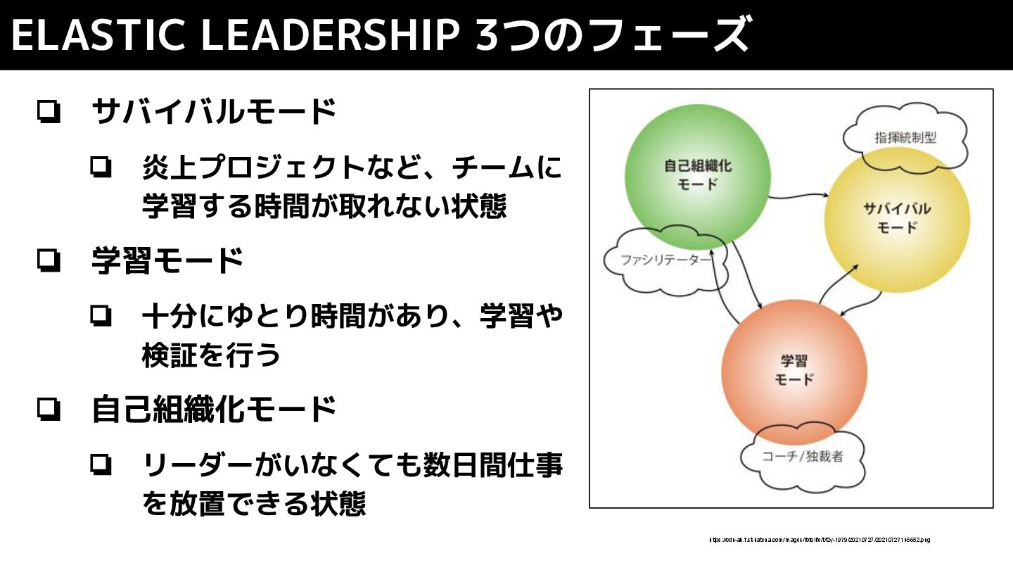 ❏ 自己組織化モード ❏ リーダーがいなくても数日間仕事 を放置できる状態 ELASTIC LEADERSHIP 3つのフェーズ https://cdn-ak.f.st-hatena.com/images/fotolife/t/t2y-1979/20210727/20210727145652.png