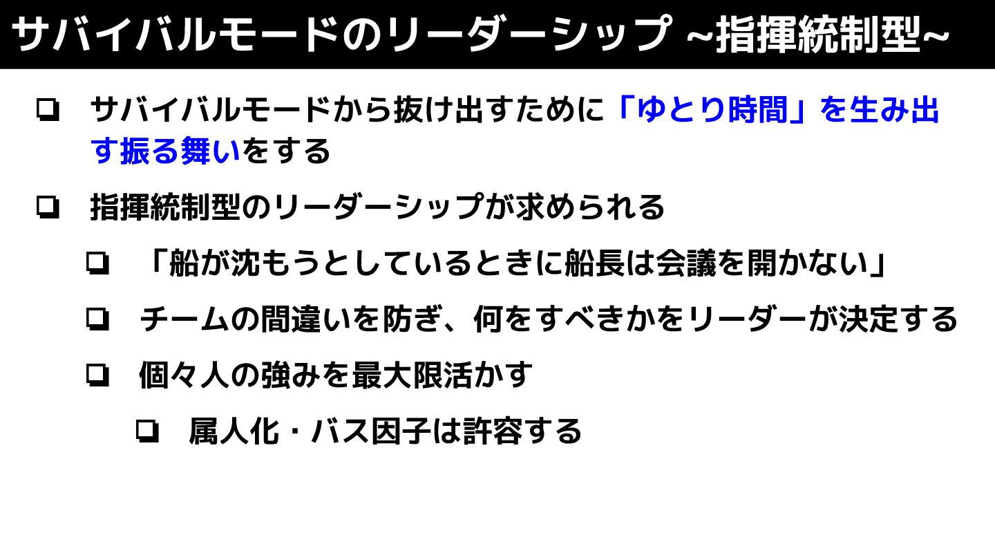 サバイバルモードのリーダーシップ ~指揮統制型~ ❏ サバイバルモードから抜け出すために「ゆとり時間」を生み出 す振る舞いをする ❏ 指揮統制型のリーダーシップが求められる ❏ 「船が沈もうとしているときに船長は会議を開かない」 ❏