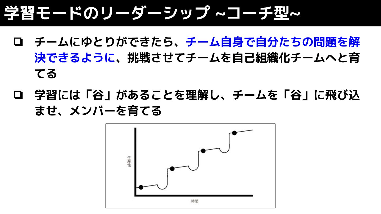 学習モードのリーダーシップ ~コーチ型~ ❏ チームにゆとりができたら、チーム自身で自分たちの問題を解 決できるように、挑戦させてチームを自己組織化チームへと育 てる ❏ 学習には「谷」があることを理解し、チームを「谷」に飛び込 ませ、メンバーを育てる