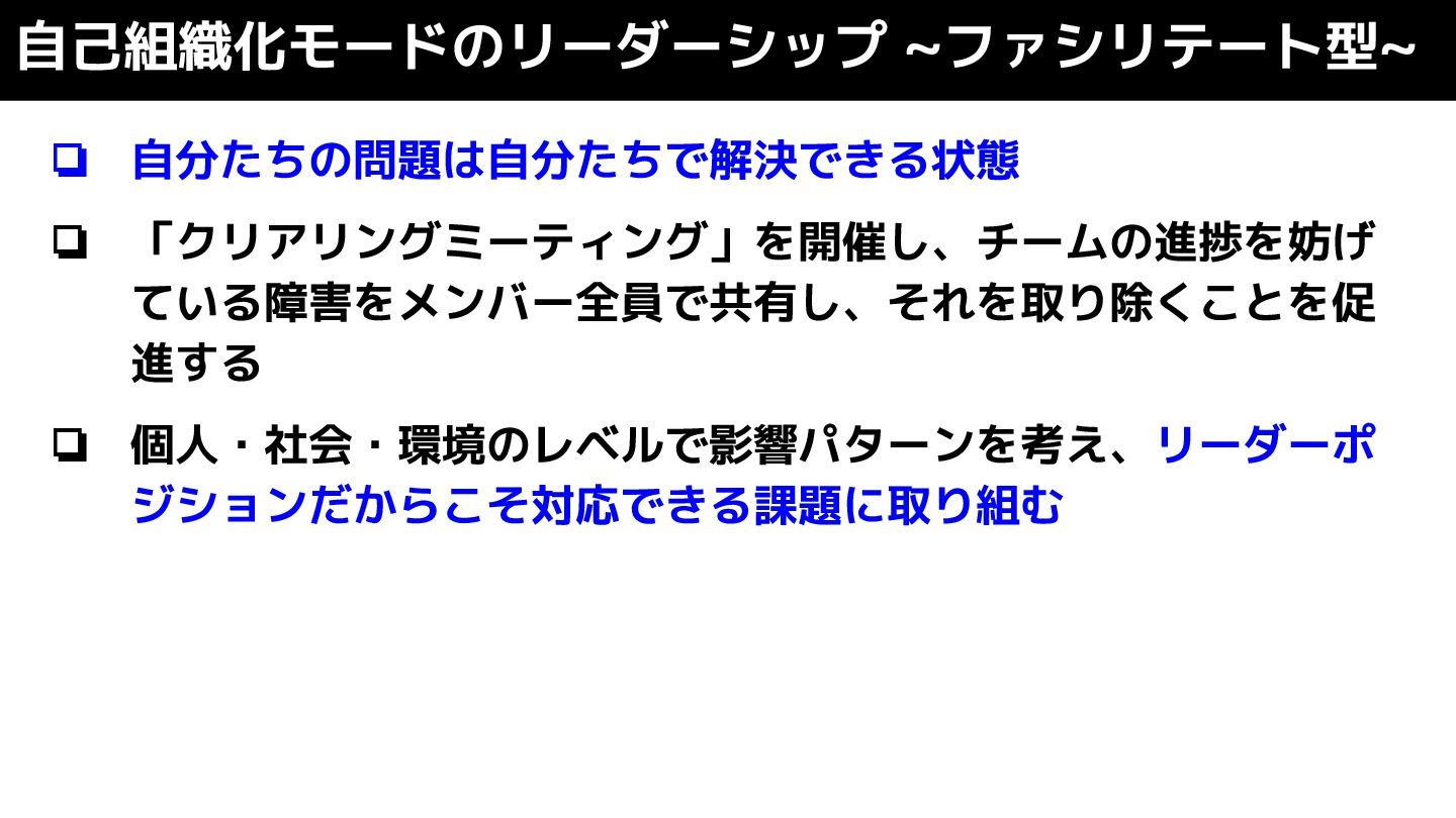 自己組織化モードのリーダーシップ ~ファシリテート型~ ❏ 自分たちの問題は自分たちで解決できる状態 ❏ 「クリアリングミーティング」を開催し、チームの進捗を妨げ ている障害をメンバー全員で共有し、それを取り除くことを促 進する ❏ 個人・社会・環境のレベルで影響パターンを考え、リーダーポ