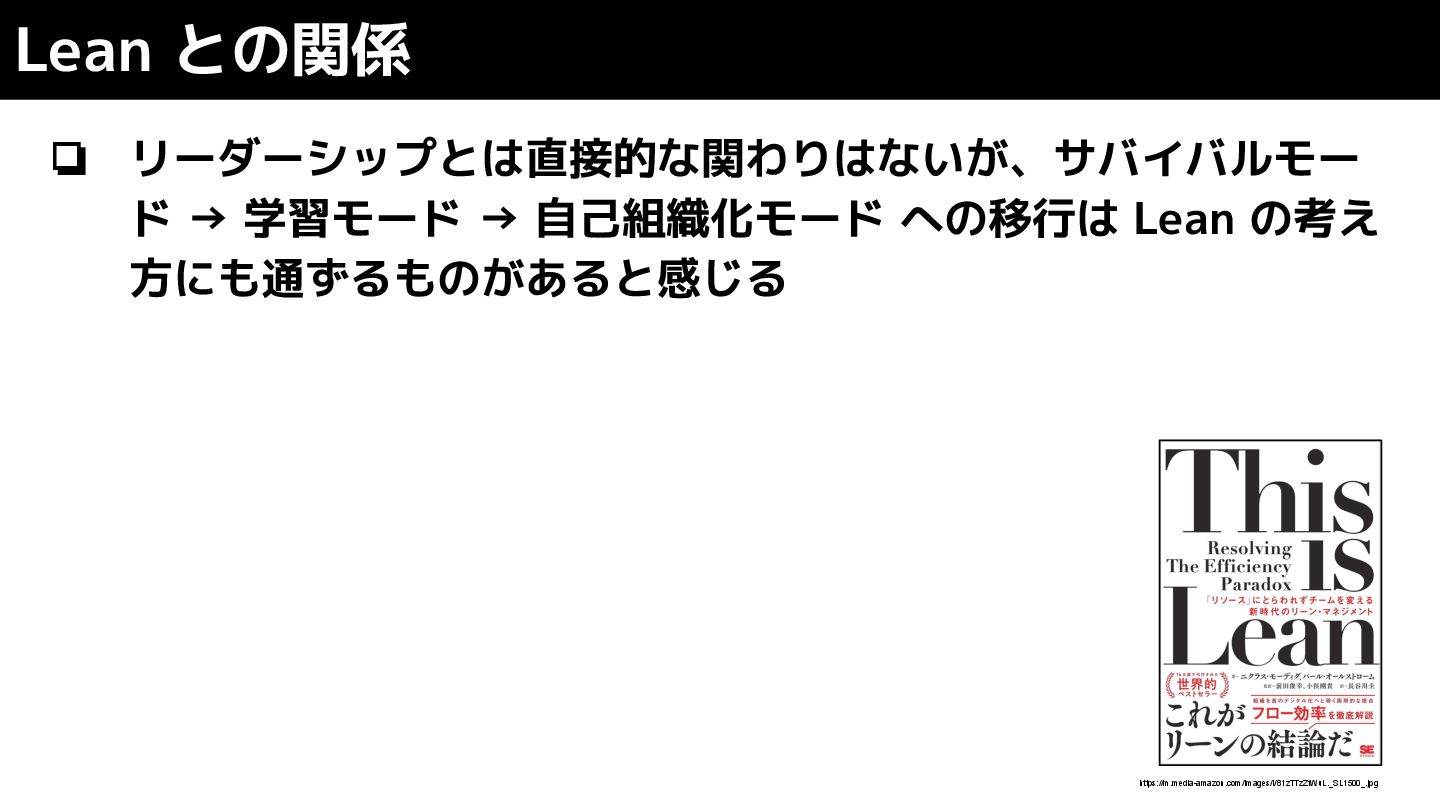 Lean との関係 ❏ リーダーシップとは直接的な関わりはないが、サバイバルモー ド → 学習モード → 自己組織化モード への移行は