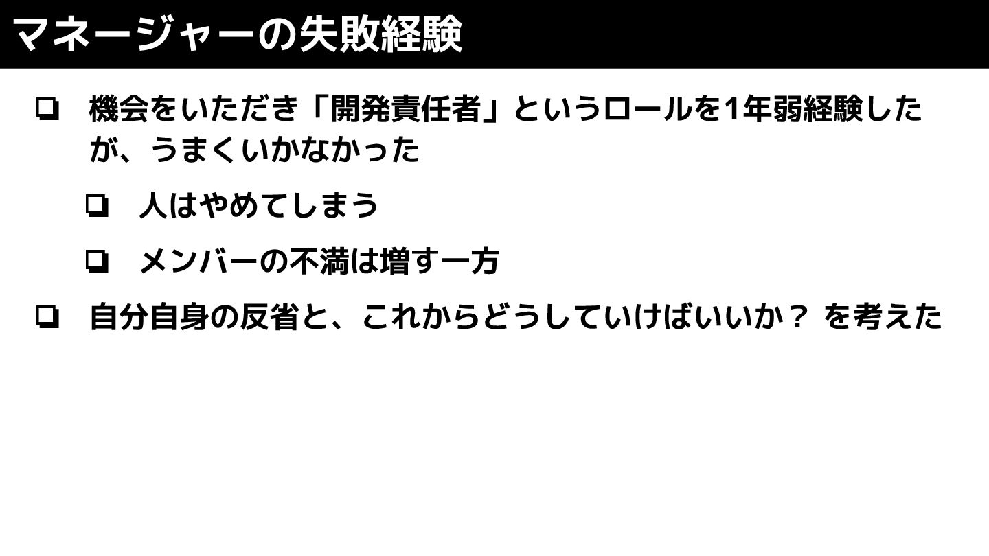 ❏ 機会をいただき「開発責任者」というロールを1年弱経験した が、うまくいかなかった ❏ 人はやめてしまう ❏ メンバーの不満は増す一方 ❏ 自分自身の反省と、これからどうしていけばいいか? を考えた