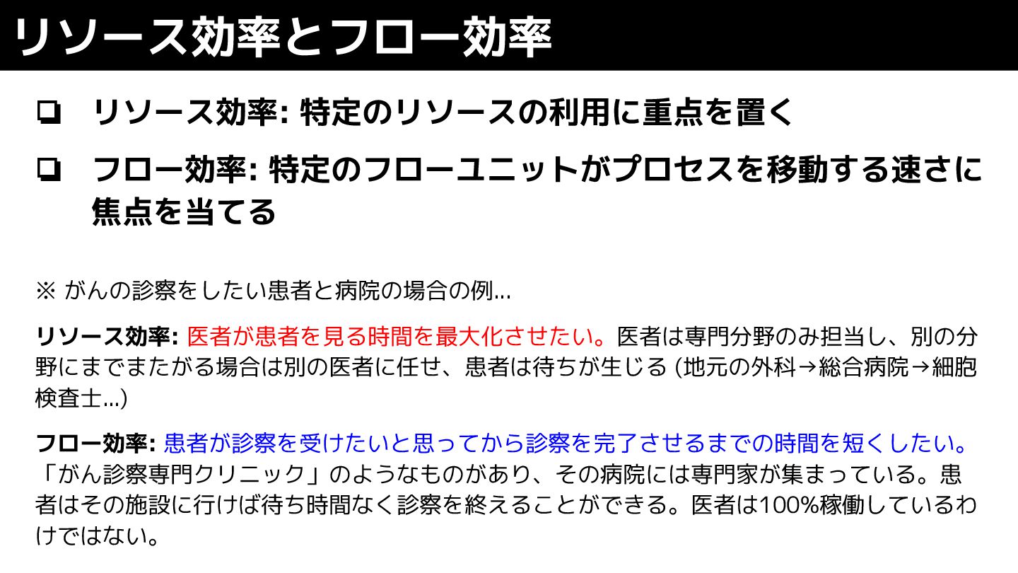 リソース効率: 医者が患者を見る時間を最大化させたい。医者は専門分野のみ担当し、別の分 野にまでまたがる場合は別の医者に任せ、患者は待ちが生じる (地元の外科→総合病院→細胞 検査士...) フロー効率: 患者が診察を受けたいと思ってから診察を完了させるまでの時間を短くしたい。 「がん診察専門クリニック」のようなものがあり、その病院には専門家が集まっている。患 者はその施設に行けば待ち時間なく診察を終えることができる。医者は100%稼働しているわ けではない。