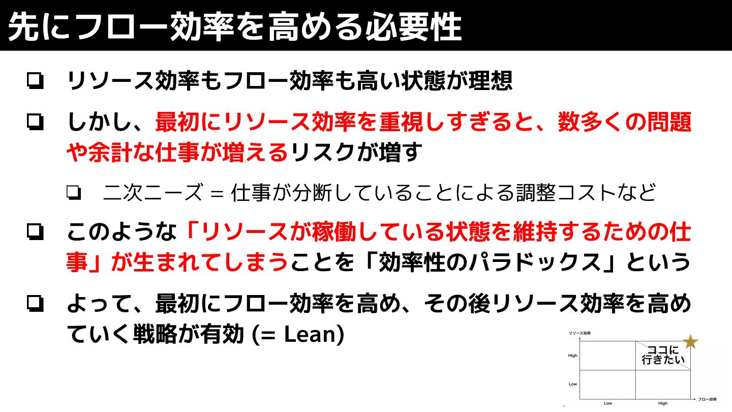 このような「リソースが稼働している状態を維持するための仕 事」が生まれてしまうことを「効率性のパラドックス」という ❏ よって、最初にフロー効率を高め、その後リソース効率を高め ていく戦略が有効 (= Lean) 先にフロー効率を高める必要性