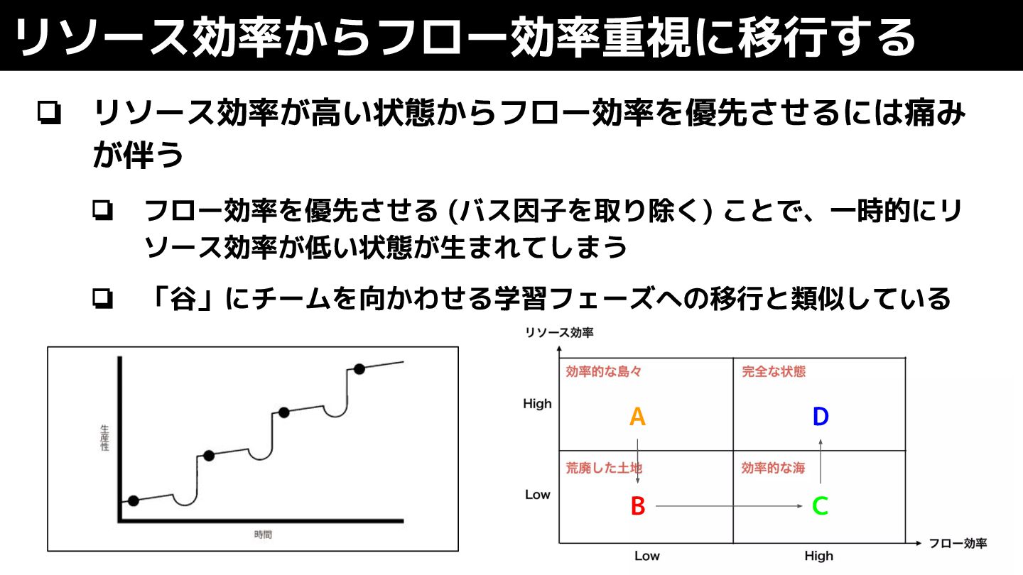 ❏ リソース効率が高い状態からフロー効率を優先させるには痛み が伴う ❏ フロー効率を優先させる (バス因子を取り除く) ことで、一時的にリ ソース効率が低い状態が生まれてしまう ❏ 「谷」にチームを向かわせる学習フェーズへの移行と類似している