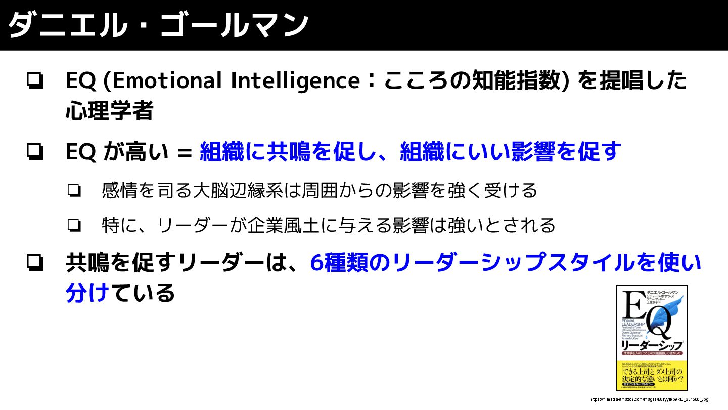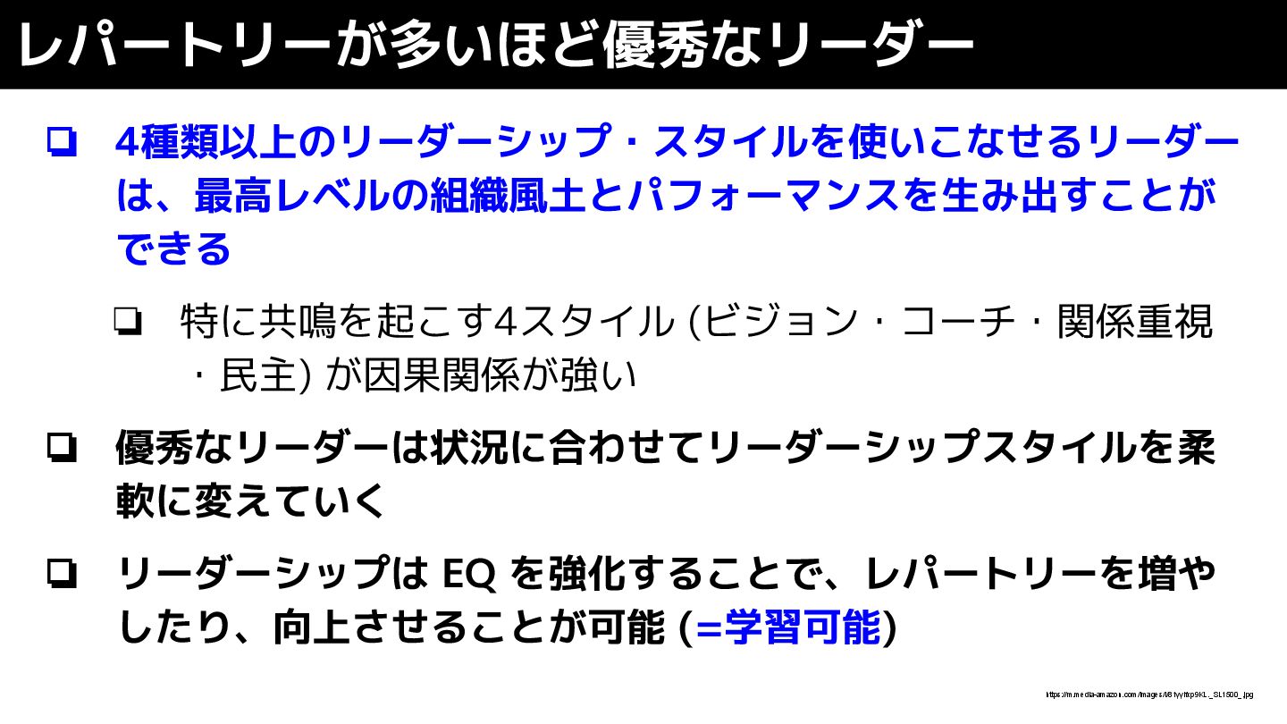 優秀なリーダーは状況に合わせてリーダーシップスタイルを柔 軟に変えていく ❏ リーダーシップは EQ を強化することで、レパートリーを増や したり、向上させることが可能 (=学習可能) レパートリーが多いほど優秀なリーダー https://m.media-amazon.com/images/I/81yyifxp9KL._SL1500_.jpg