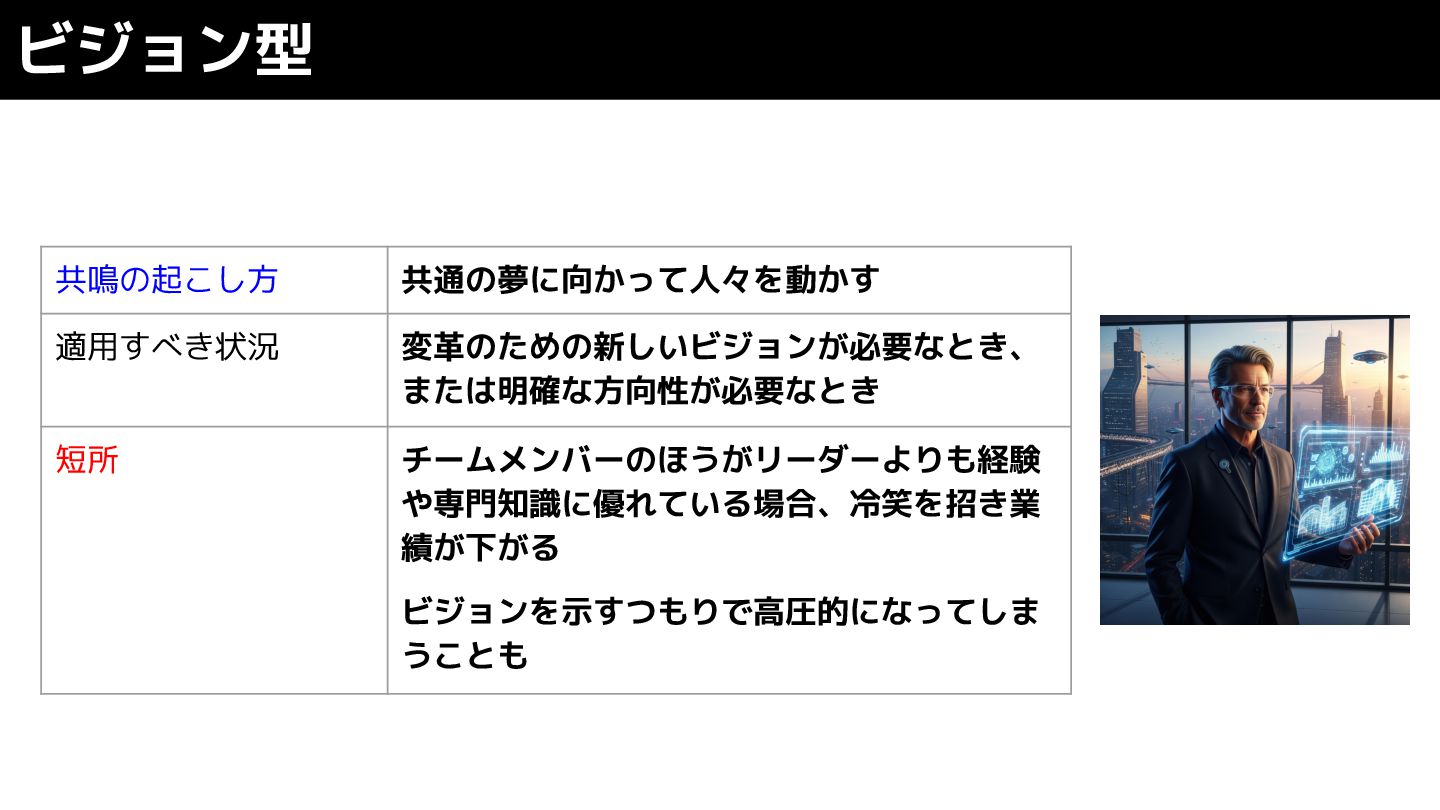 ビジョン型 共鳴の起こし方 共通の夢に向かって人々を動かす 適用すべき状況 変革のための新しいビジョンが必要なとき、 または明確な方向性が必要なとき 短所 チームメンバーのほうがリーダーよりも経験 や専門知識に優れている場合、冷笑を招き業 績が下がる