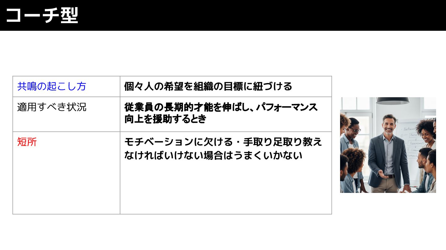 コーチ型 共鳴の起こし方 個々人の希望を組織の目標に紐づける 適用すべき状況 従業員の長期的才能を伸ばし、パフォーマンス 向上を援助するとき 短所 モチベーションに欠ける・手取り足取り教え なければいけない場合はうまくいかない