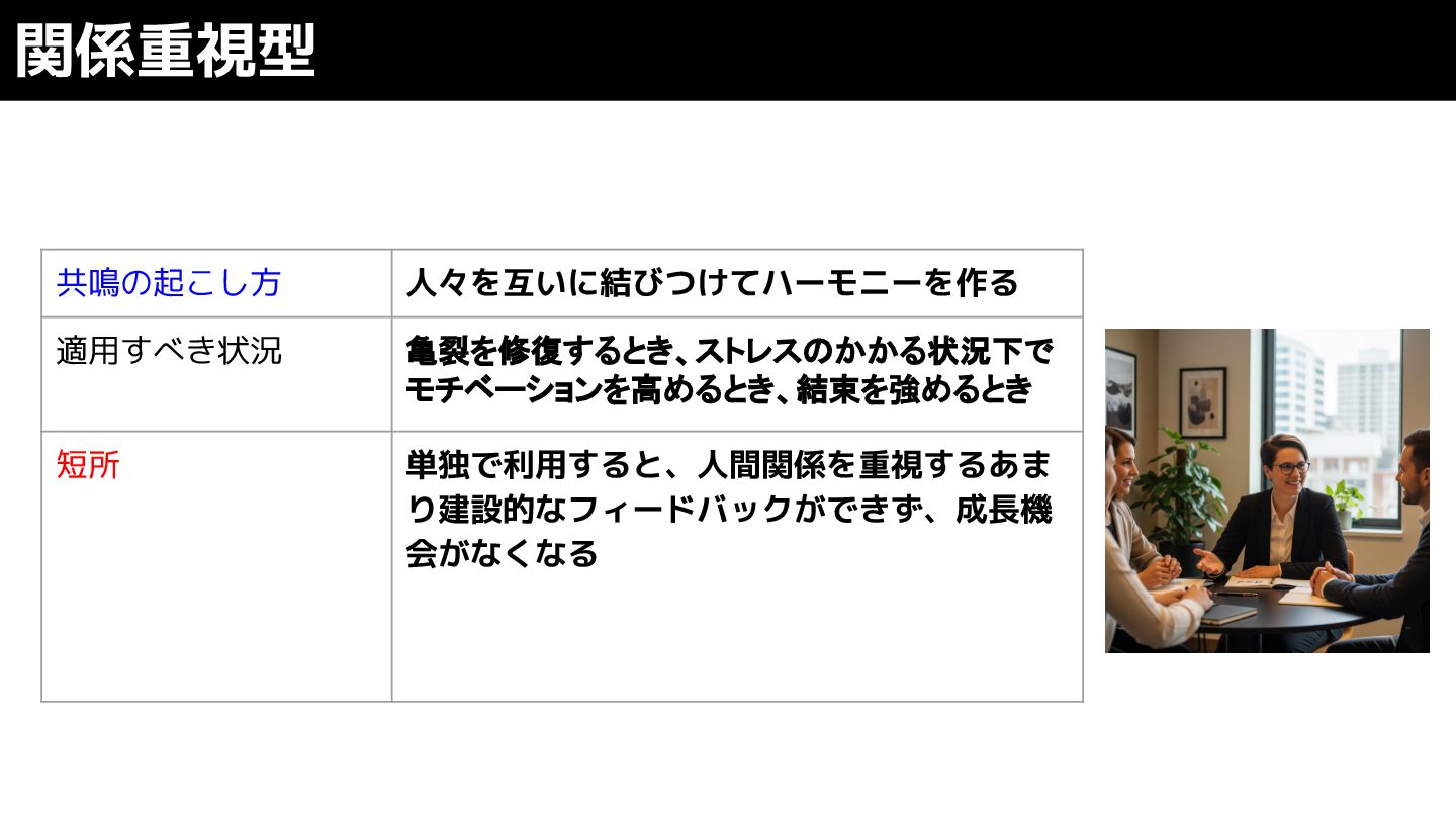 関係重視型 共鳴の起こし方 人々を互いに結びつけてハーモニーを作る 適用すべき状況 亀裂を修復するとき、ストレスのかかる状況下で モチベーションを高めるとき、結束を強めるとき 短所 単独で利用すると、人間関係を重視するあま り建設的なフィードバックができず、成長機 会がなくなる