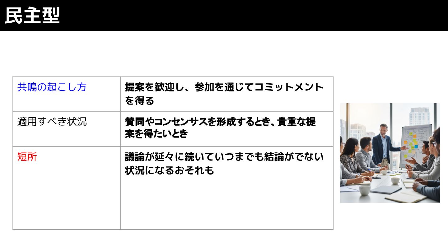 民主型 共鳴の起こし方 提案を歓迎し、参加を通じてコミットメント を得る 適用すべき状況 賛同やコンセンサスを形成するとき、貴重な提 案を得たいとき 短所 議論が延々に続いていつまでも結論がでない 状況になるおそれも