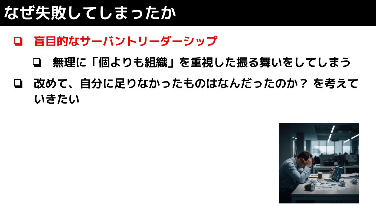 なぜ失敗してしまったか ❏ 盲目的なサーバントリーダーシップ ❏ 無理に「個よりも組織」を重視した振る舞いをしてしまう ❏ 改めて、自分に足りなかったものはなんだったのか? を考えて いきたい