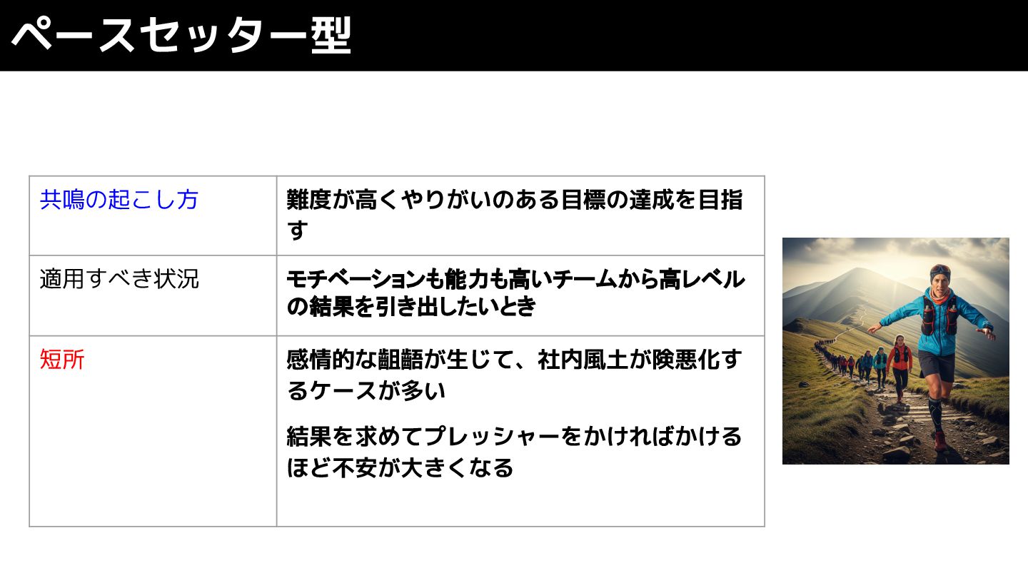 ペースセッター型 共鳴の起こし方 難度が高くやりがいのある目標の達成を目指 す 適用すべき状況 モチベーションも能力も高いチームから高レベル の結果を引き出したいとき 短所 感情的な齟齬が生じて、社内風土が険悪化す るケースが多い