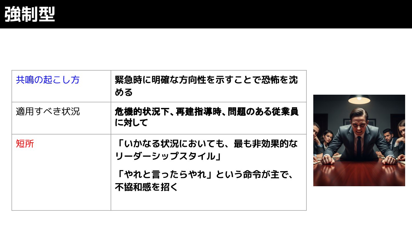 ❏ 強制型 6種類のリーダーシップスタイル https://m.media-amazon.com/images/I/81yyifxp9KL._SL1500_.jpg
