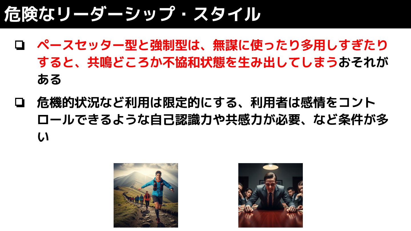 ❏ ペースセッター型と強制型は、無謀に使ったり多用しすぎたり すると、共鳴どころか不協和状態を生み出してしまうおそれが ある ❏ 危機的状況など利用は限定的にする、利用者は感情をコント ロールできるような自己認識力や共感力が必要、など条件が多 い 危険なリーダーシップ・スタイル