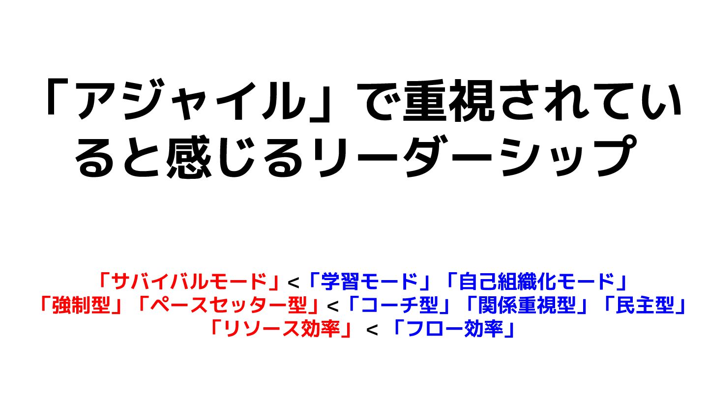 「アジャイル」で重視されてい ると感じるリーダーシップ 「サバイバルモード」<「学習モード」「自己組織化モード」 「強制型」「ペースセッター型」<「コーチ型」「関係重視型」「民主型」 「リソース効率」 < 「フロー効率」