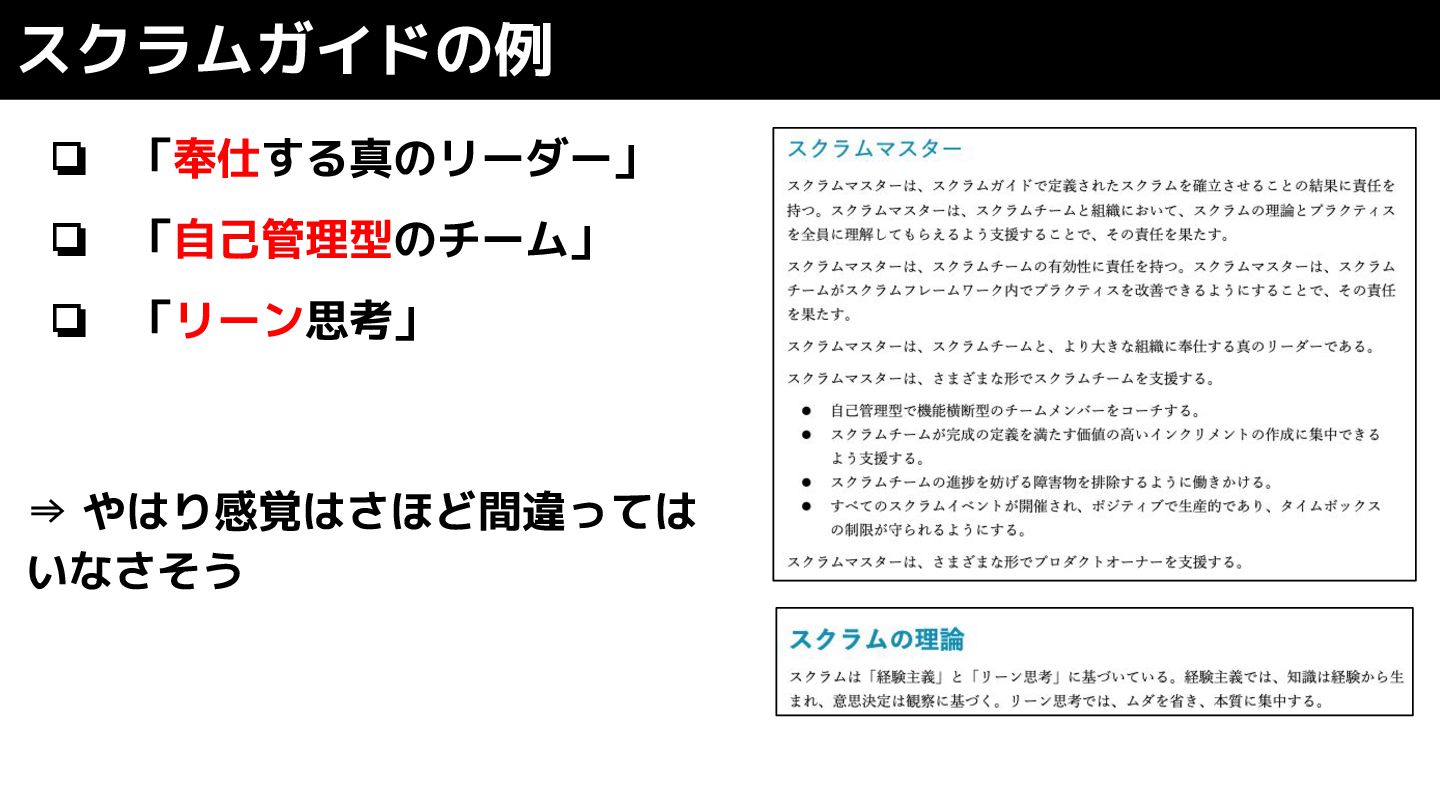 ❏ 「奉仕する真のリーダー」 ❏ 「自己管理型のチーム」 ❏ 「リーン思考」 スクラムガイドの例 ⇒ やはり感覚はさほど間違っては いなさそう