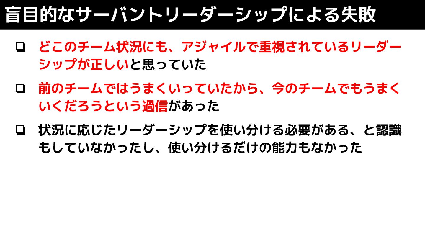 ❏ どこのチーム状況にも、アジャイルで重視されているリーダー シップが正しいと思っていた ❏ 前のチームではうまくいっていたから、今のチームでもうまく いくだろうという過信があった ❏ 状況に応じたリーダーシップを使い分ける必要がある、と認識 もしていなかったし、使い分けるだけの能力もなかった 盲目的なサーバントリーダーシップによる失敗