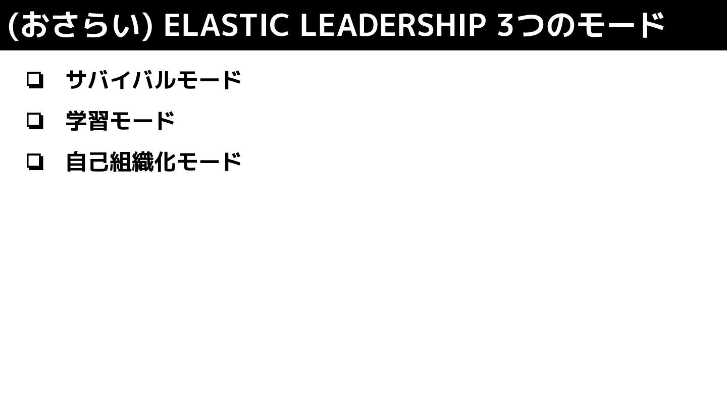 ❏ サバイバルモード ❏ 学習モード ❏ 自己組織化モード (おさらい) ELASTIC LEADERSHIP 3つのモード