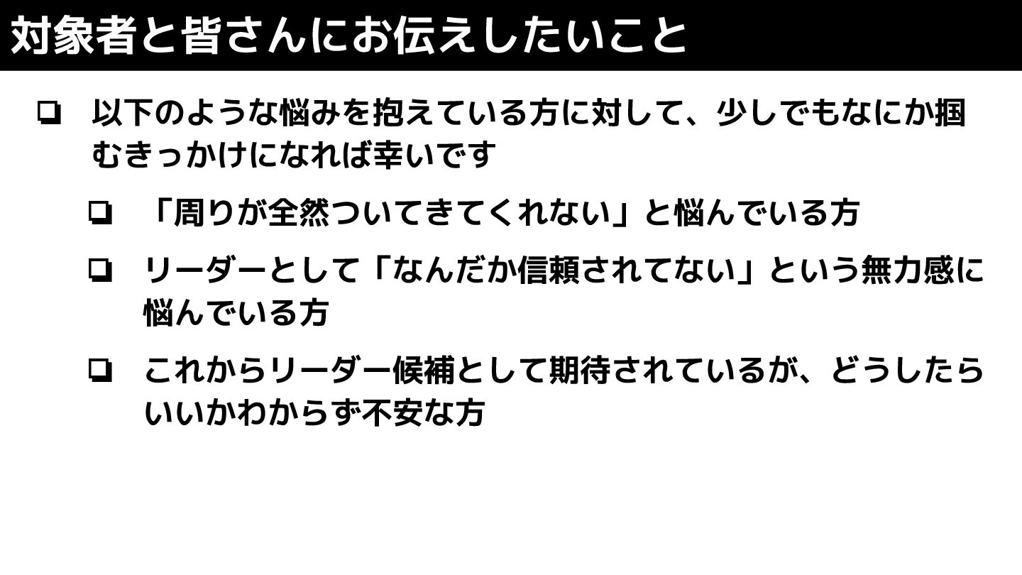 ❏ 以下のような悩みを抱えている方に対して、少しでもなにか掴 むきっかけになれば幸いです ❏ 「周りが全然ついてきてくれない」と悩んでいる方 ❏ リーダーとして「なんだか信頼されてない」という無力感に 悩んでいる方 ❏ これからリーダー候補として期待されているが、どうしたら